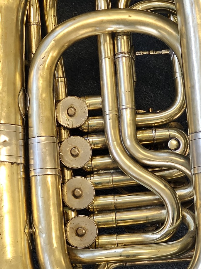 This presumably 100 year old tuba is in great condition. This tuba was beyond its time, looking at the layout. Valve paddles with adaptable tension, open wrap valve tubing and all slides are easily accessible to pull and make minor corrections. Also the smokestack bell gives the instrument a nice sound which can project well.