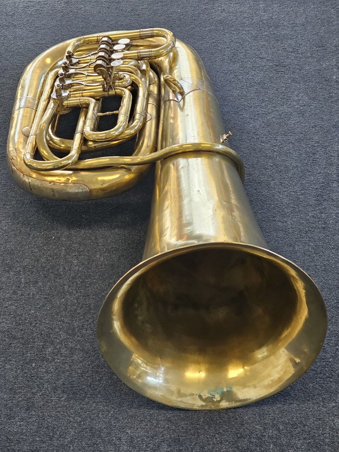 De tuba is gereviseerd. Alle ventielen en stembuizen zijn licht beweegbaar en de compressie is goed (gezien de leeftijd). De meeste deuken zijn verwijderd en de tuba is chemisch gereinigd en met de hand gepolijst.