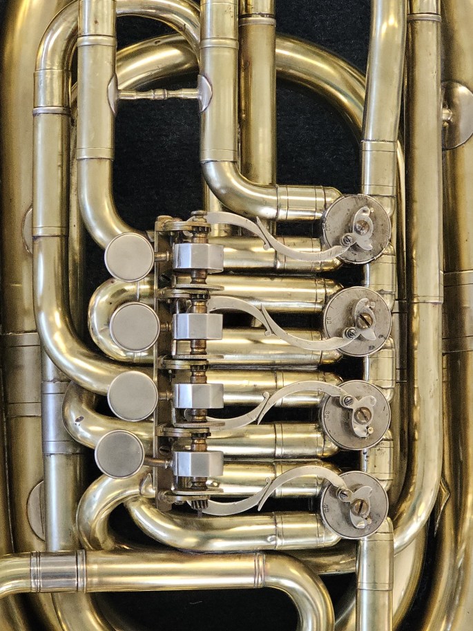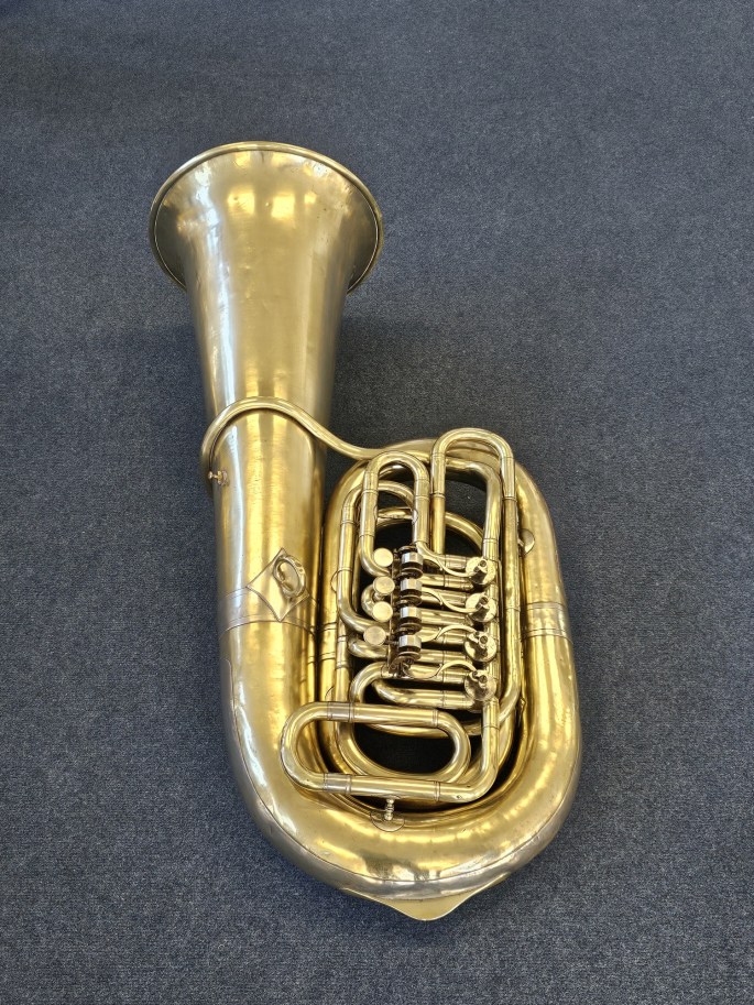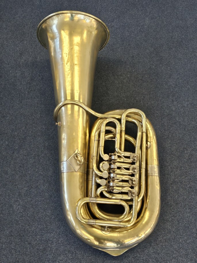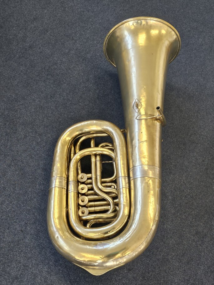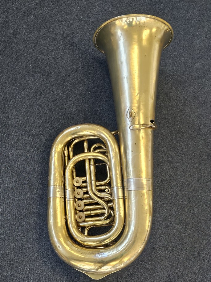 Deze waarschijnlijk meer dan 100 jaar oude tuba is in goede staat. Als je naar de lay-out kijkt, was deze tuba zijn tijd ver vooruit. Drukwerk met instelbare spanning, open constructie en alle stembuizen zijn gemakkelijk toegankelijk om te trekken en kleine correcties aan te brengen. Ook de schoorsteenvormige beker geeft het instrument een mooie klank die goed te projecteren is.