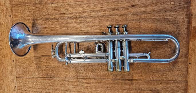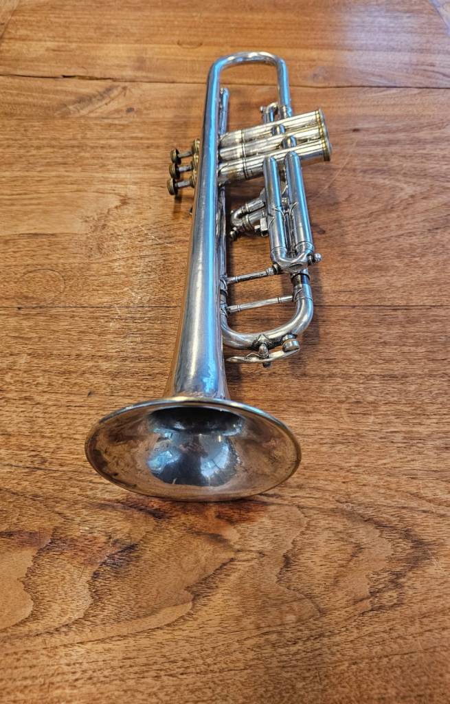 Deze verzilverde trompet is in goede staat. Alle ventielen en schuiven bewegen goed en de compressie is goed.
