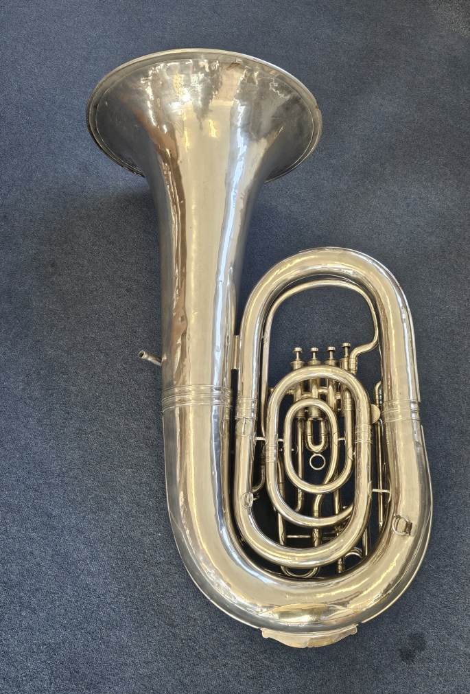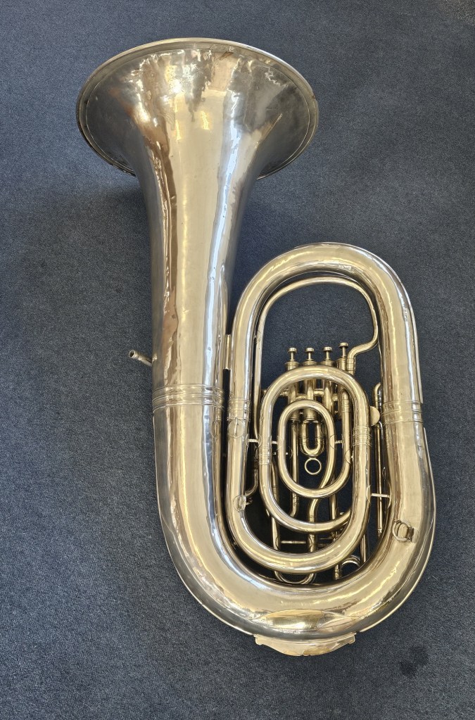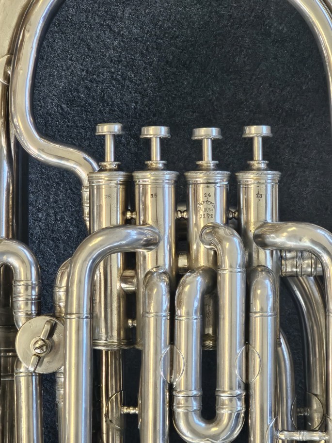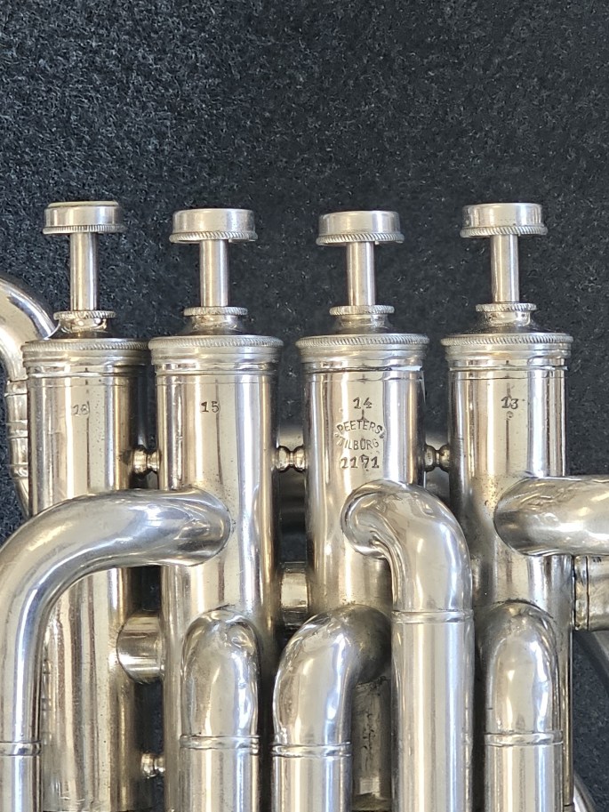Eine außergewöhnliche und seltene 5/4 Tuba in C, gefertigt von Ad Peeters aus Tilburg. Dieses besondere Instrument überzeugt durch seine einzigartige Bauweise und seine imposante Größe.
