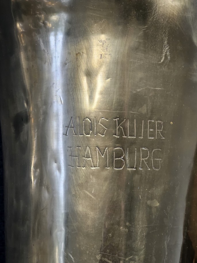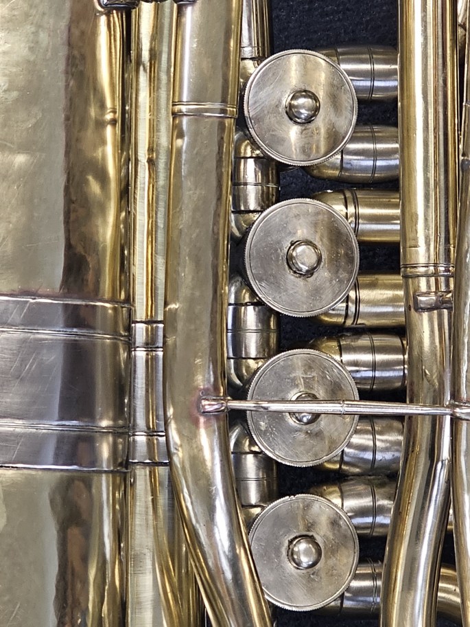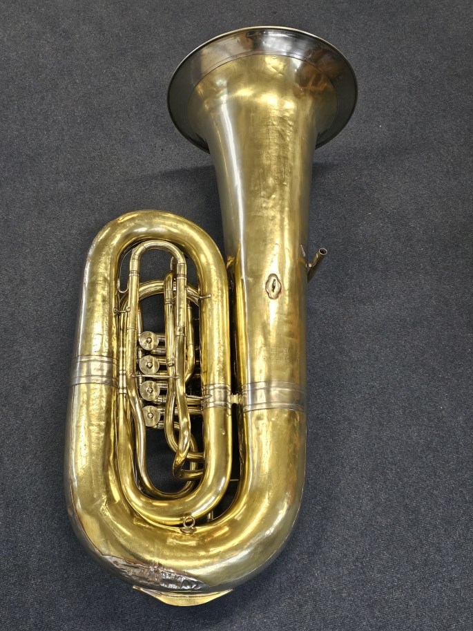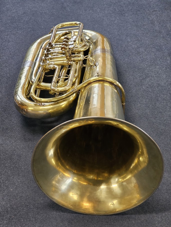 Een bijzonder en indrukwekkend instrument: een zeer grote Kaiser Bes Bas Tuba, gebouwd door Alois Kujer uit Hamburg. Dit exemplaar is uniek, want het werd ooit in opdracht gemaakt voor het politieorkest van Hamburg (zie foto’s voor de tuba in actie). De tuba is geheel nagekeken en in goede conditie, met een diepe en majestueuze klank.