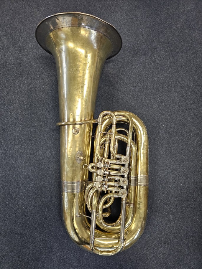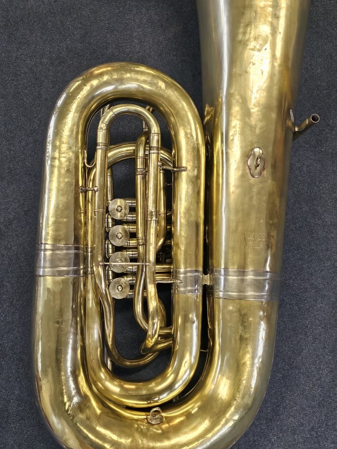 Eine außergewöhnliche und eindrucksvolle sehr große Kaiser B-Tuba, handgefertigt von Alois Kujer aus Hamburg. Dieses Instrument ist ein echtes Unikat, da es ursprünglich im Auftrag für das Polizeiorchester Hamburg gebaut wurde (auf dem Bildern auch zu sehen). Es wurde komplett überprüft und ist in gutem Zustand, mit einem tiefen und majestätischen Klang.