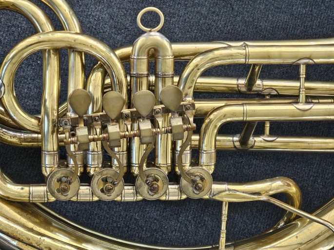 For sale: a BBb Helicon made by an unknown German maker, likely attributed to Ernst David (Bielefeld). This instrument features 4 valves and offers excellent playability.