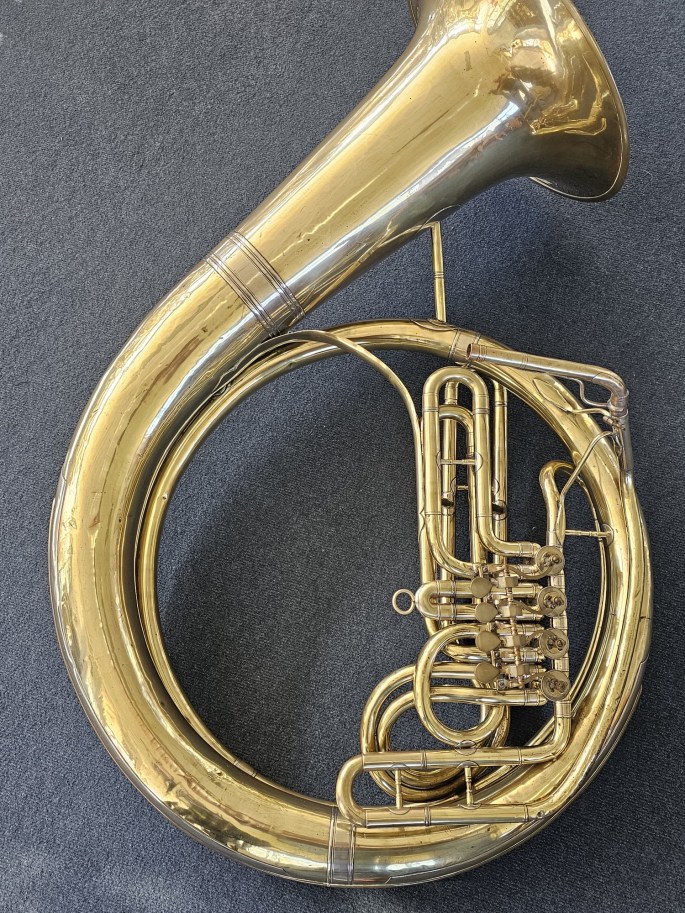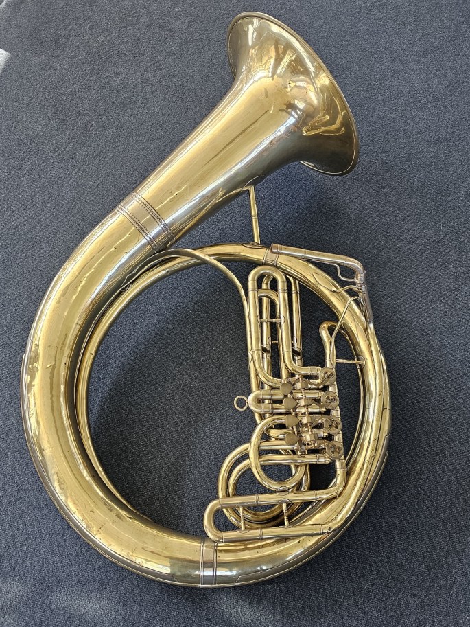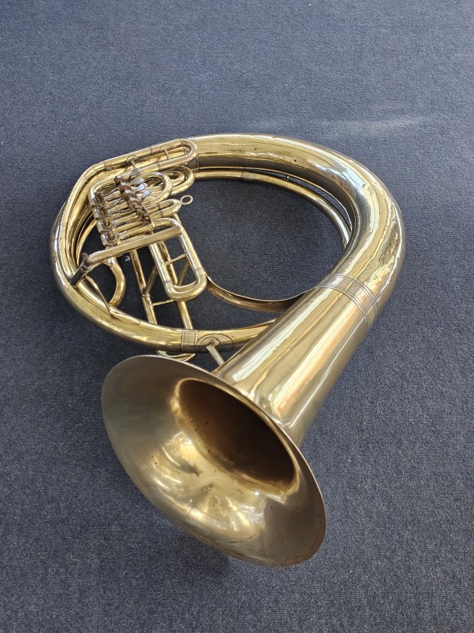 Zu verkaufen: ein Helikon in B von einem unbekannten deutschen Hersteller, vermutlich Ernst David (Bielefeld). Das Instrument ist mit 4 Ventilen ausgestattet und lässt sich sehr gut spielen.
