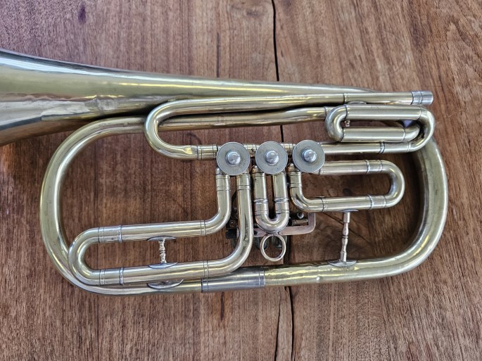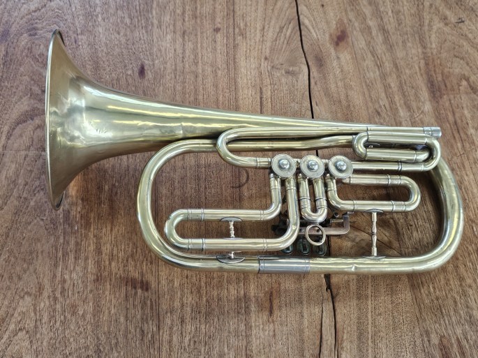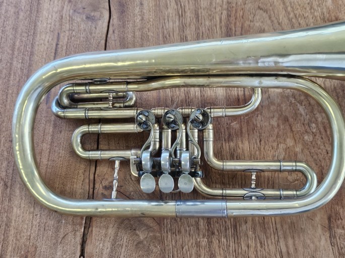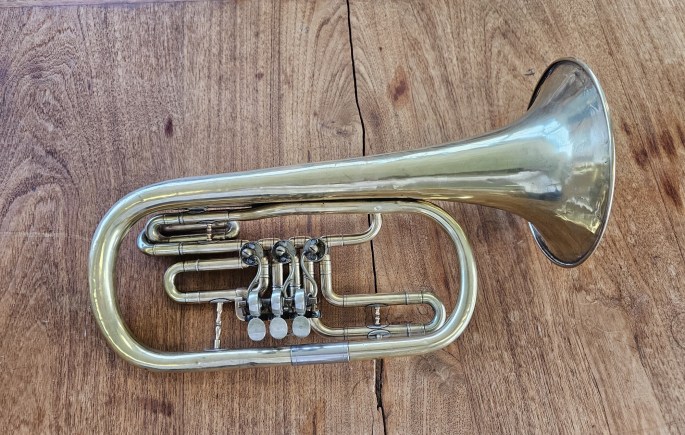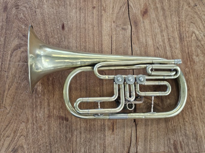 Es wurde jedoch vollständig überprüft, gewartet und ist spielbereit. Der Klang ist warm und typisch für ein Bassflügelhorn. Eine interessante Gelegenheit für Sammler oder Musiker, die ein besonderes Instrument suchen.