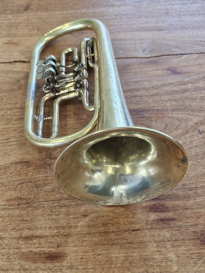 It produces a warm, characteristic tone typical of a bass flugelhorn and is ready for immediate use. A great opportunity for collectors or musicians looking for a unique and affordable instrument.