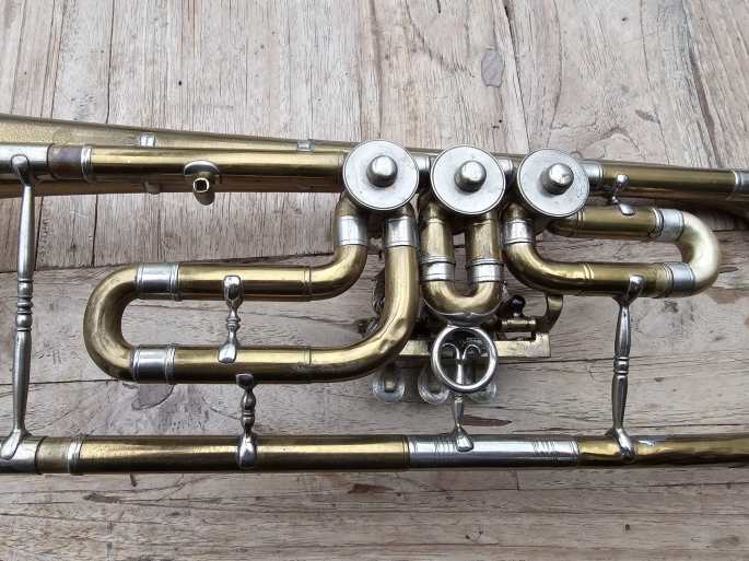 Alle ventielen en schuiven zijn gemakkelijk te bewegen en het instrument heeft een geweldig geluid. De intonatie is ook goed. Eerste ventielschuif heeft kleine reparatie nodig, lekt iets.