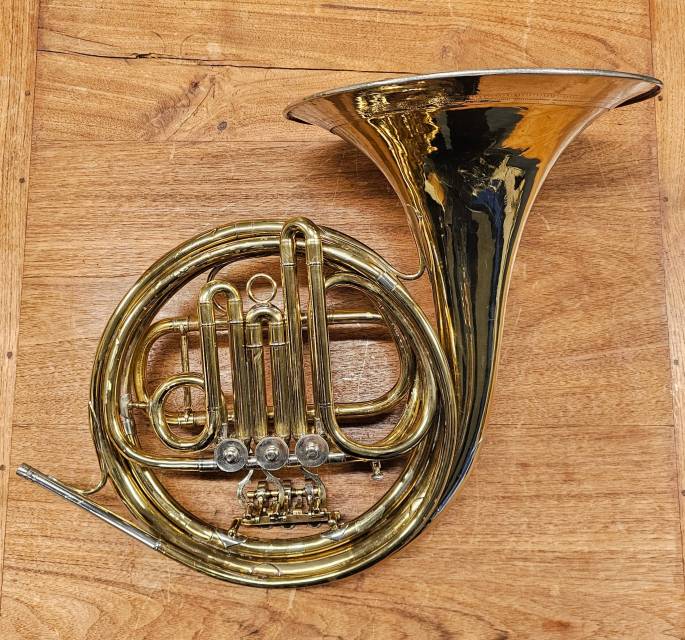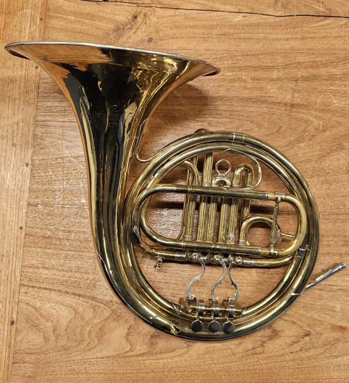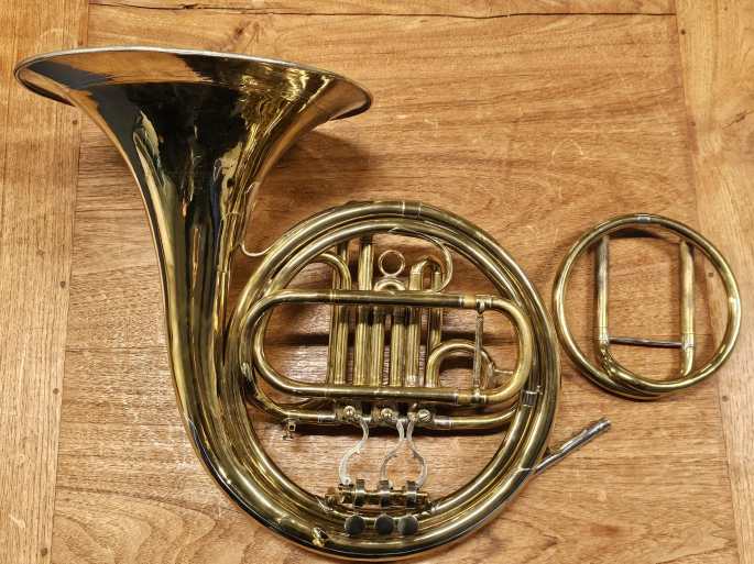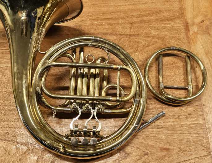 Dieses Horn wurde in der Vergangenheit überholt und neu lackiert. Der originale Es-Stimmzug war mit dem Instrument und wir haben auch einen passenden F-Zug dafür gemacht.