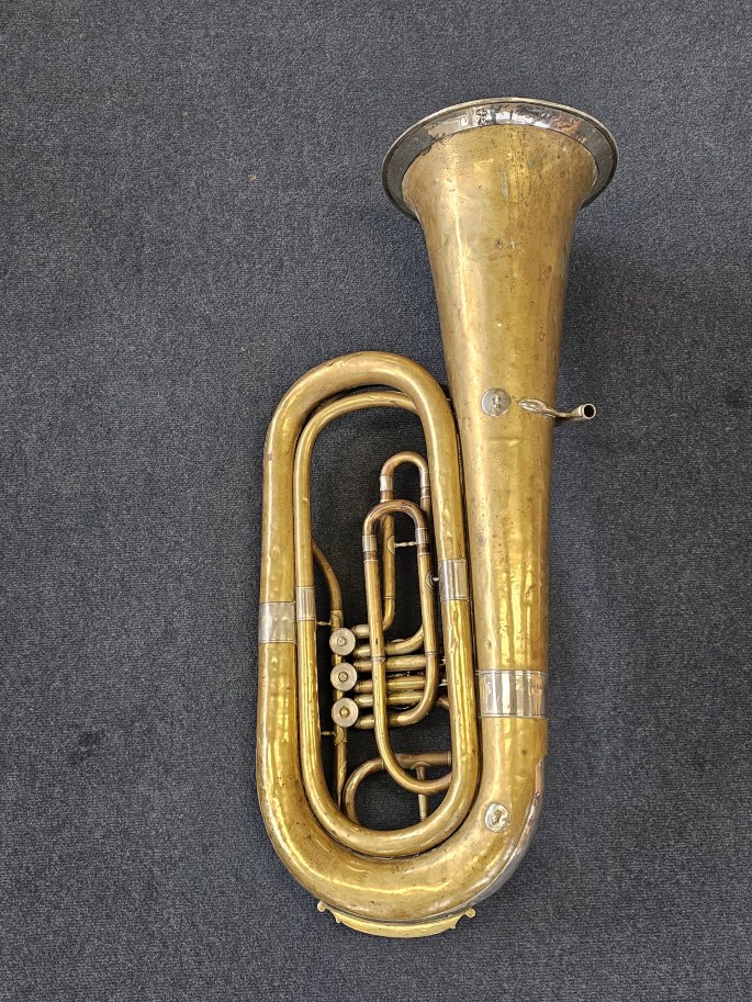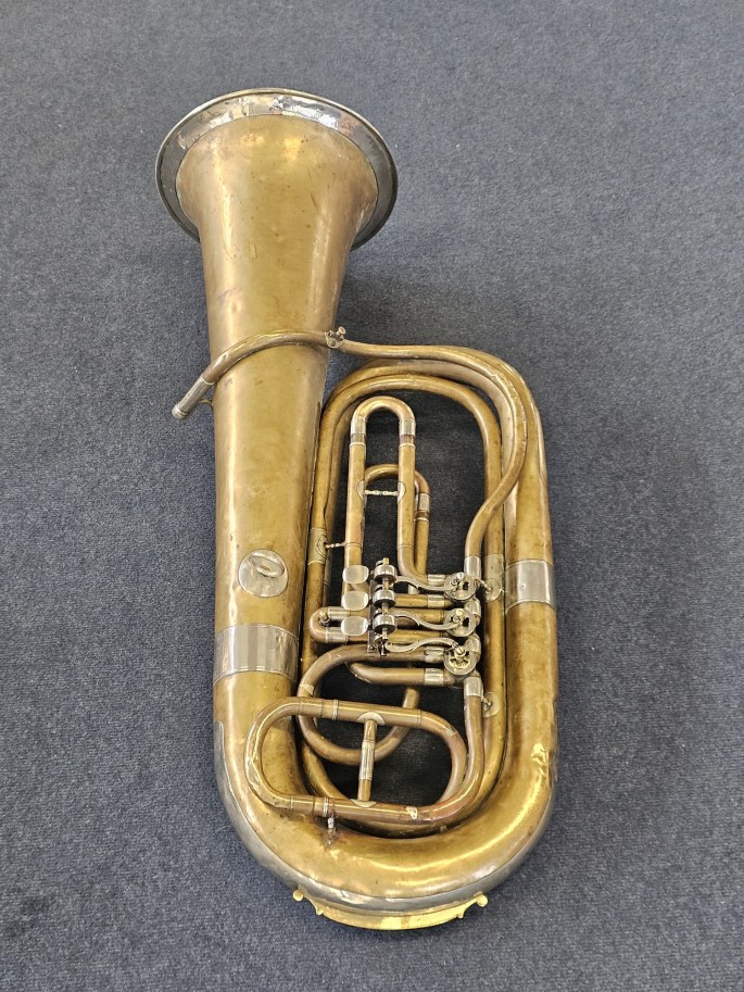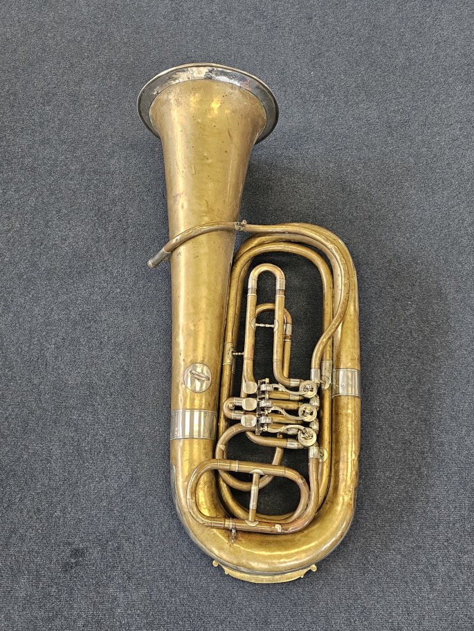 Eine kompakte 3/4 B-Tuba, gefertigt von August Clemens Glier in Markneukirchen, einer Region mit großer Tradition im Bau von Blechblasinstrumenten.