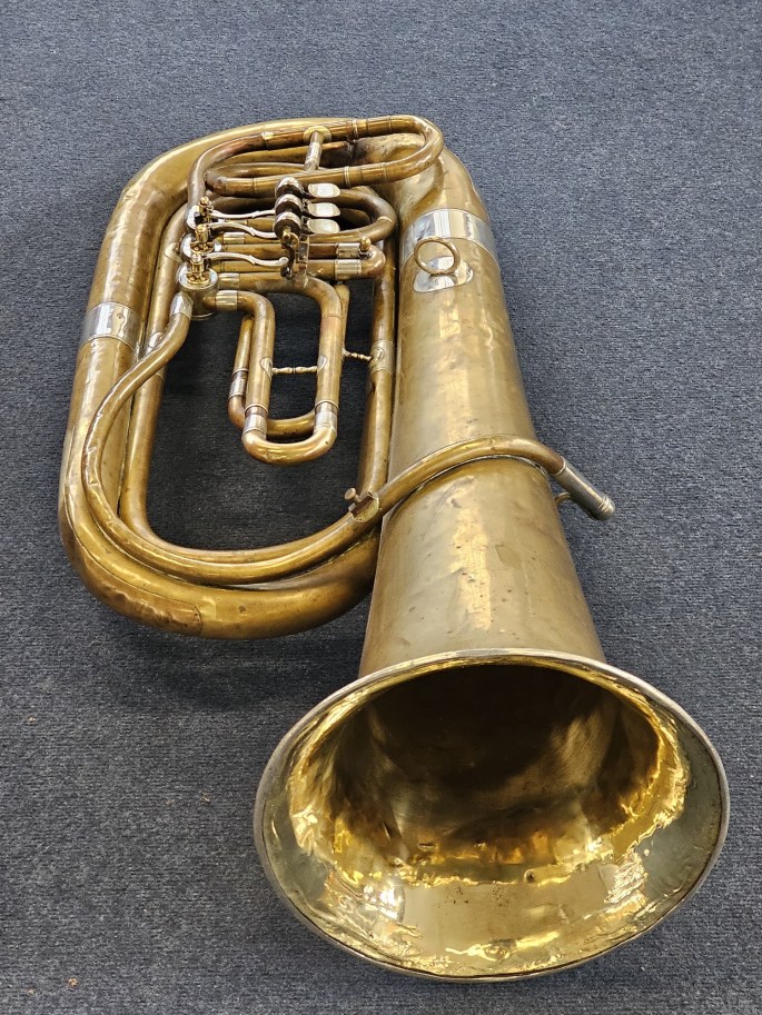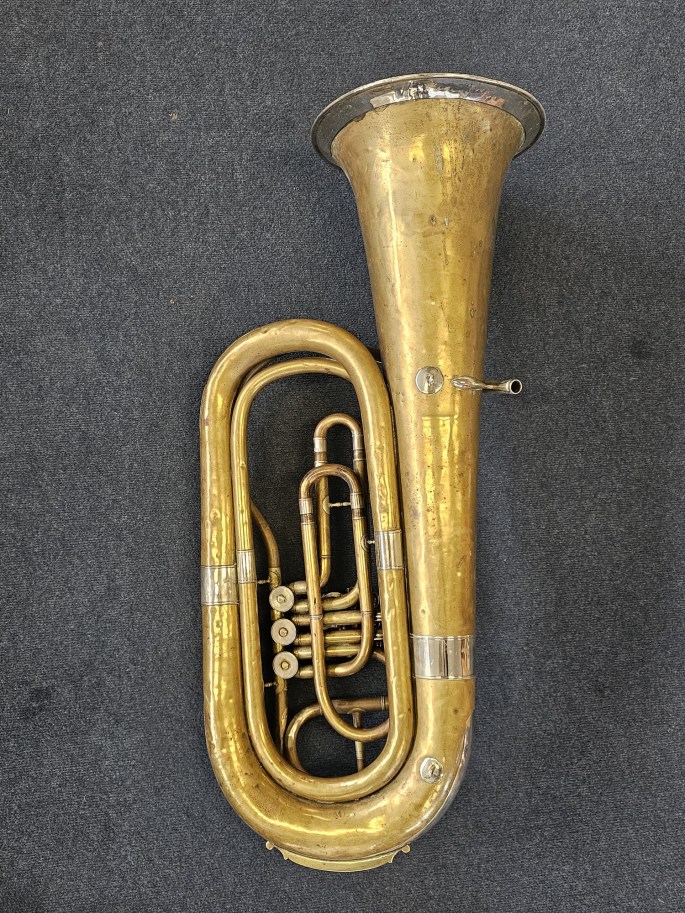 Een compacte 3/4 Bes bastuba, gebouwd door August Clemens Glier uit Markneukirchen, een plaats met een rijke traditie in de bouw van blaasinstrumenten.