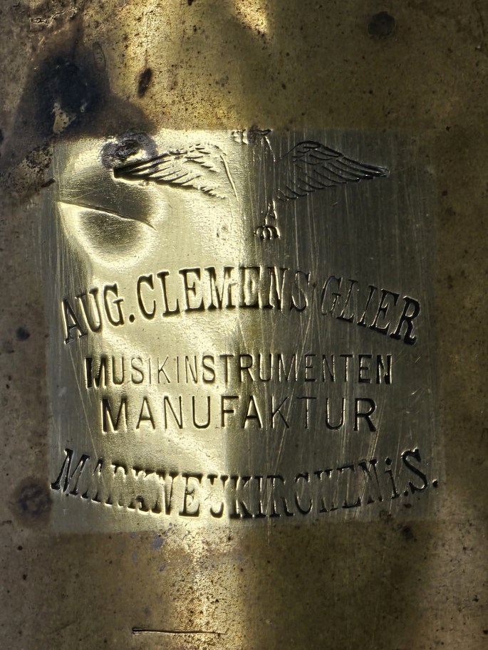 A compact 3/4 BBb tuba, made by August Clemens Glier in Markneukirchen, a region renowned for its long tradition of high-quality brass instrument making.