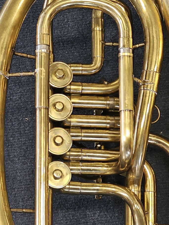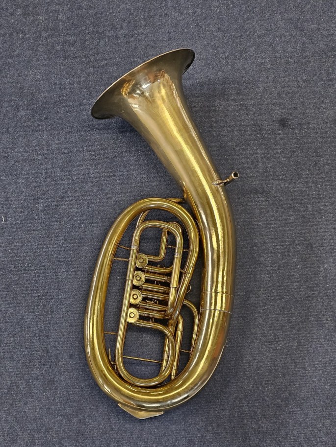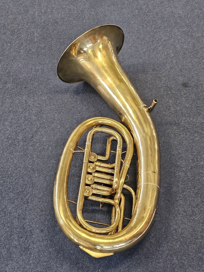 A solid and well-playing Bb oval baritone, Model 212, made by Belltone. This instrument is known for its pleasant, warm tone and reliable playability.