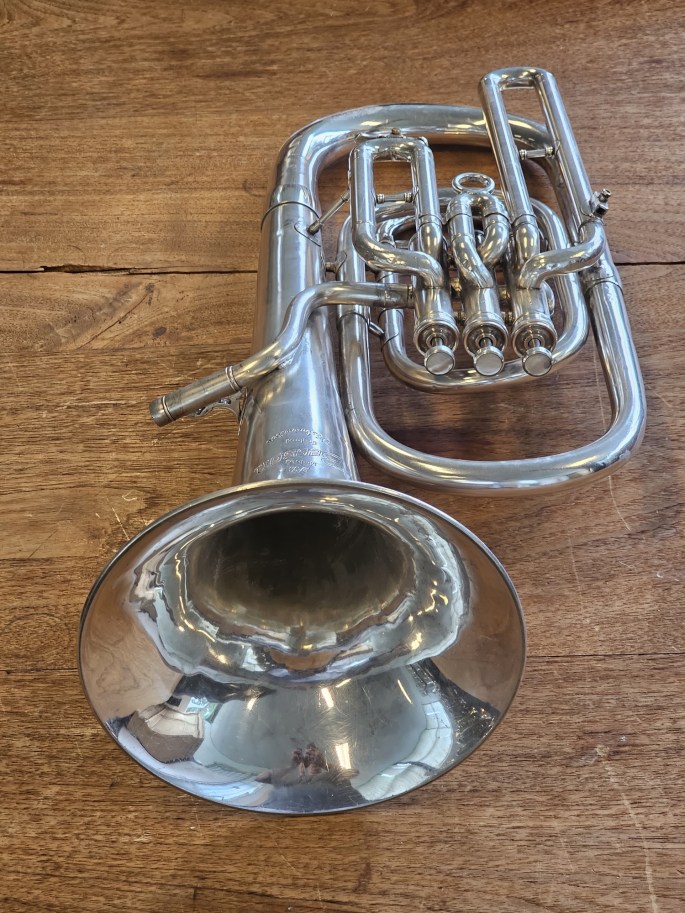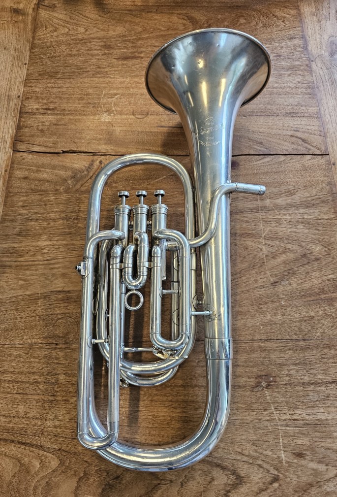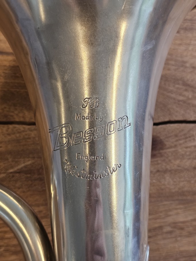 Deze Bes-bariton, model Westminster van Besson, staat bekend om zijn degelijke bouwkwaliteit en warme, zingende klank. Het instrument is geheel nagekeken en verkeert in goede conditie.