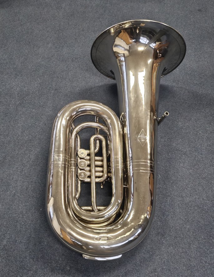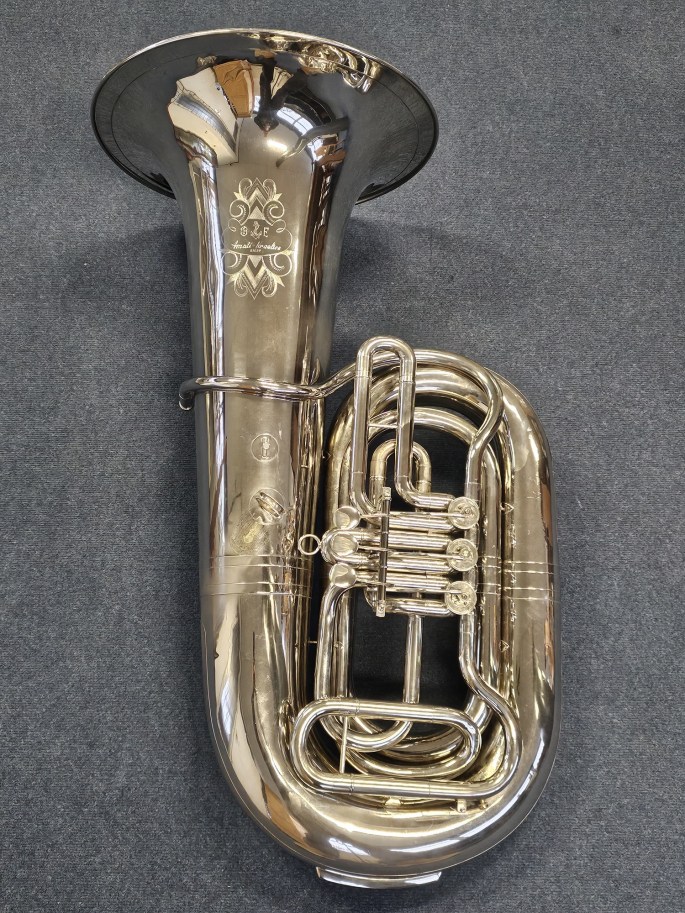 Een krachtige 5/4 Kaiser Bes bastuba, gebouwd door B&F Amati Kraslice en gelijk aan het bekende model Cerveny CBB-691.