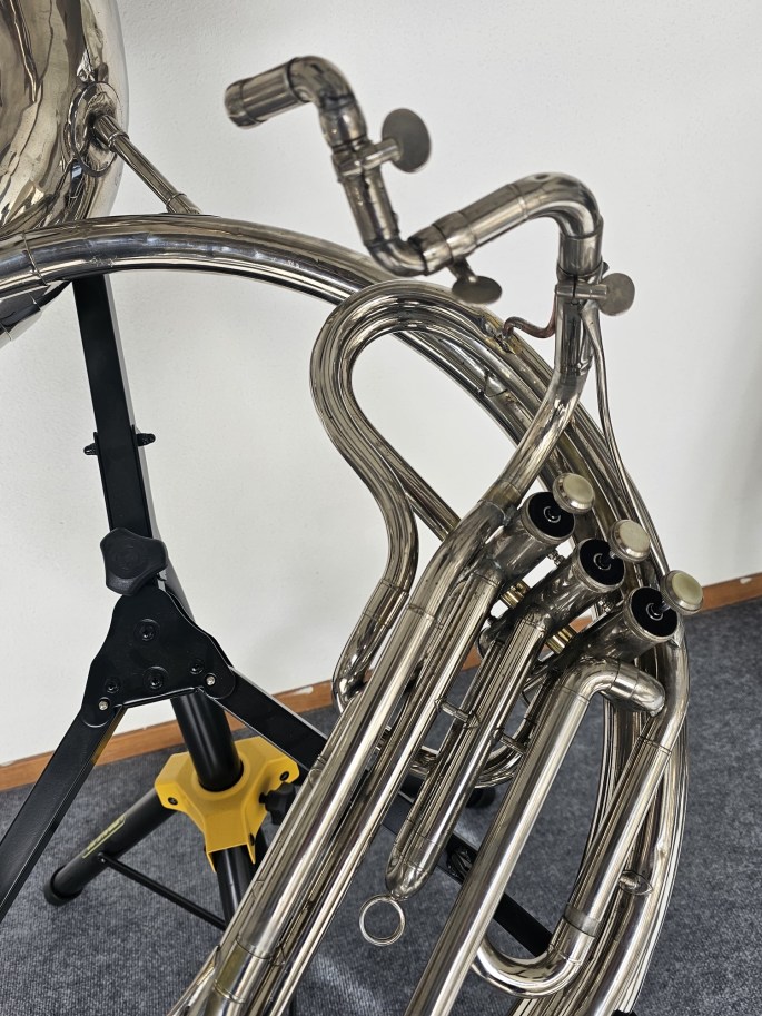 Dieses B-Sousaphon des renommierten Herstellers Bohland & Fuchs/Amati aus Graslitz ist ein solides und zuverlässiges Instrument mit Charakter. Es weist altersbedingte Gebrauchsspuren auf, befindet sich jedoch technisch in gutem Zustand.