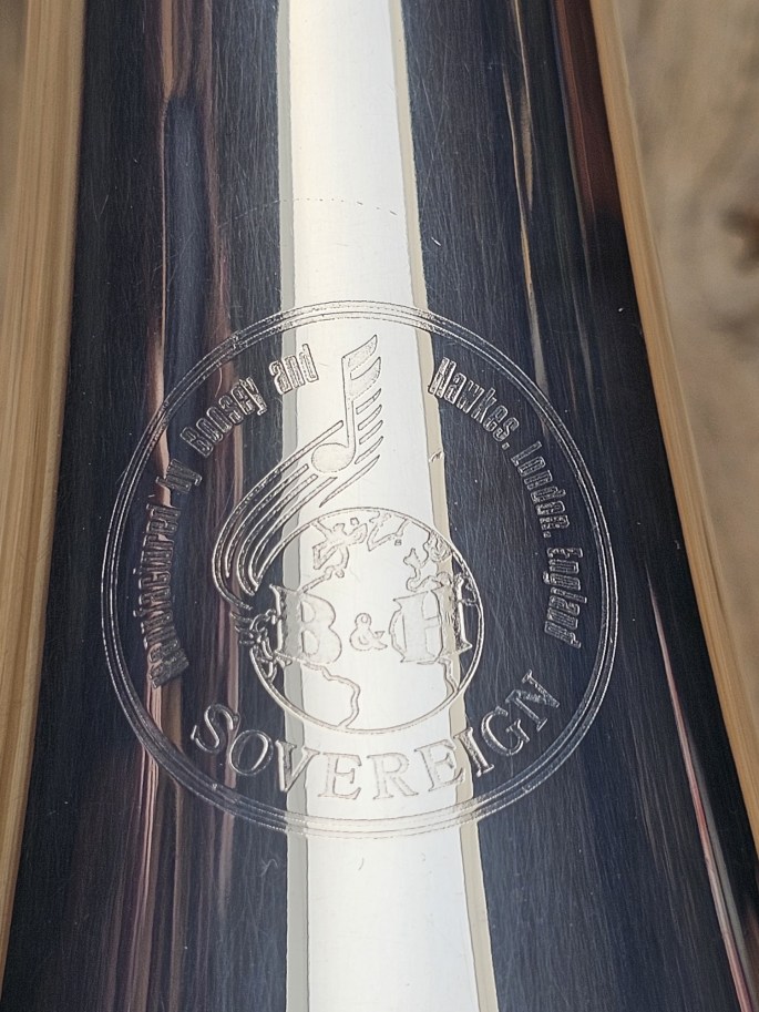 A professional bass trombone, model Sovereign / Round Stamp 562, built by Boosey & Hawkes / Besson. This instrument has been fully inspected and is ready to play.