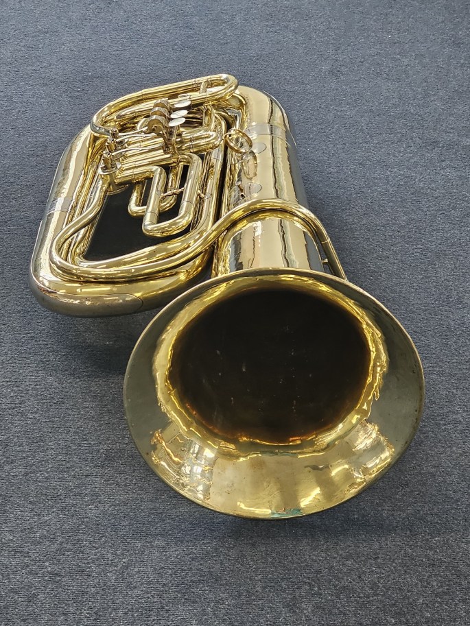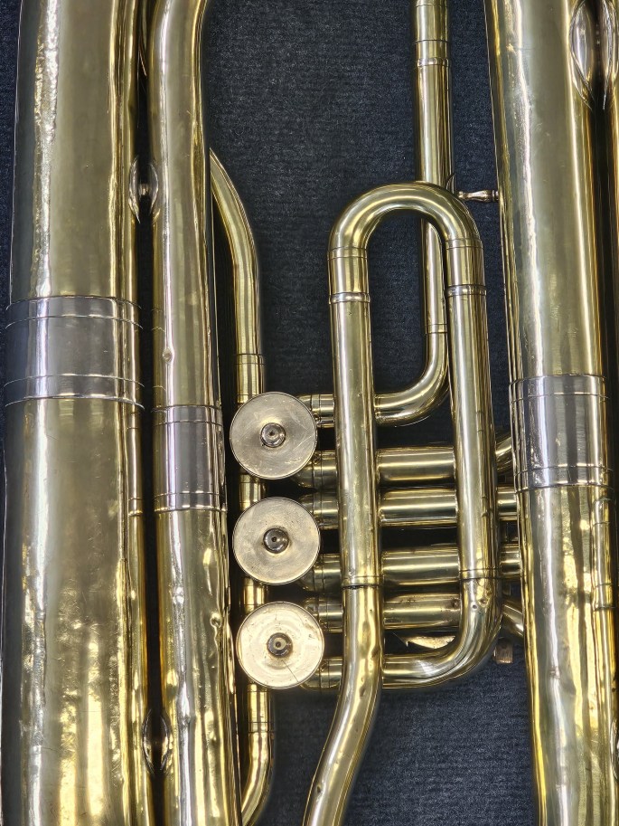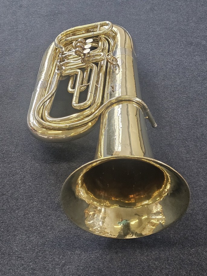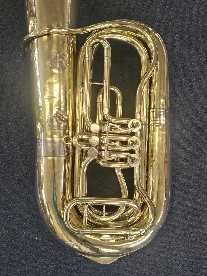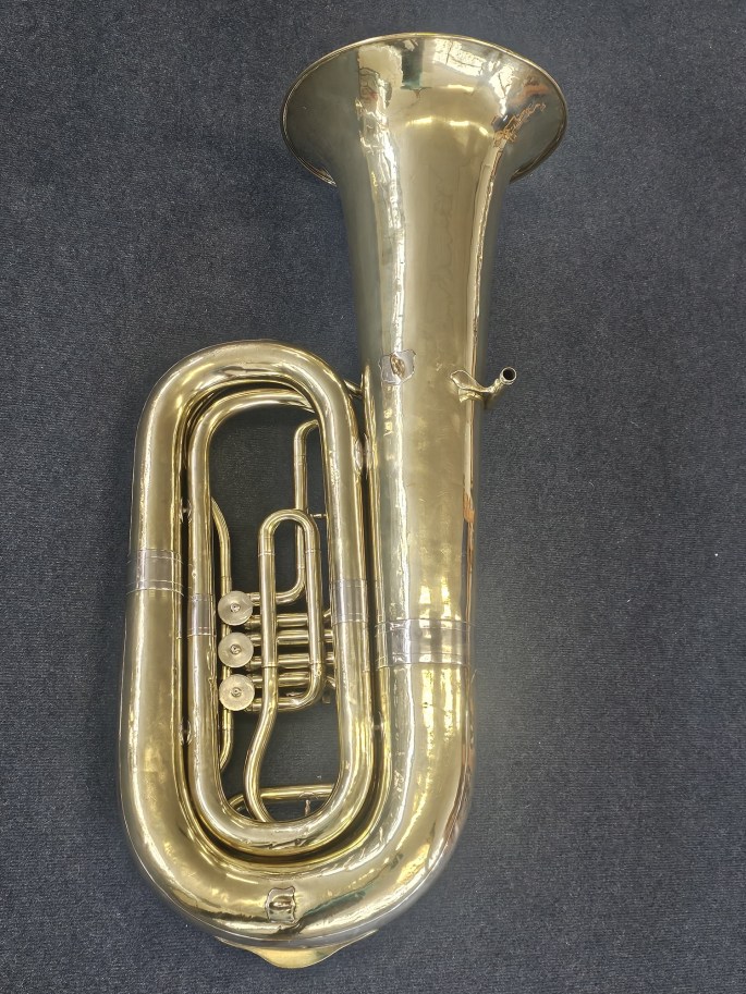 Eine hochwertige 4/4 B-Tuba, gefertigt von Bohland & Fuchs, einem bekannten böhmischen Blechblasinstrumentenhersteller seiner Zeit. Das Instrument wurde seinerzeit bei Bohland & Fuchs bestellt und durch das Musikhaus Poyda in Barmen geliefert.