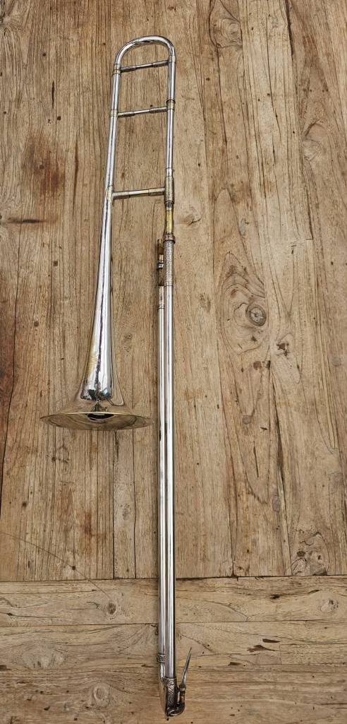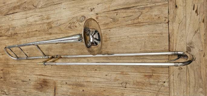 This trombone, which is more than 100 years old is in good condition. Slides has some wear, but works good.