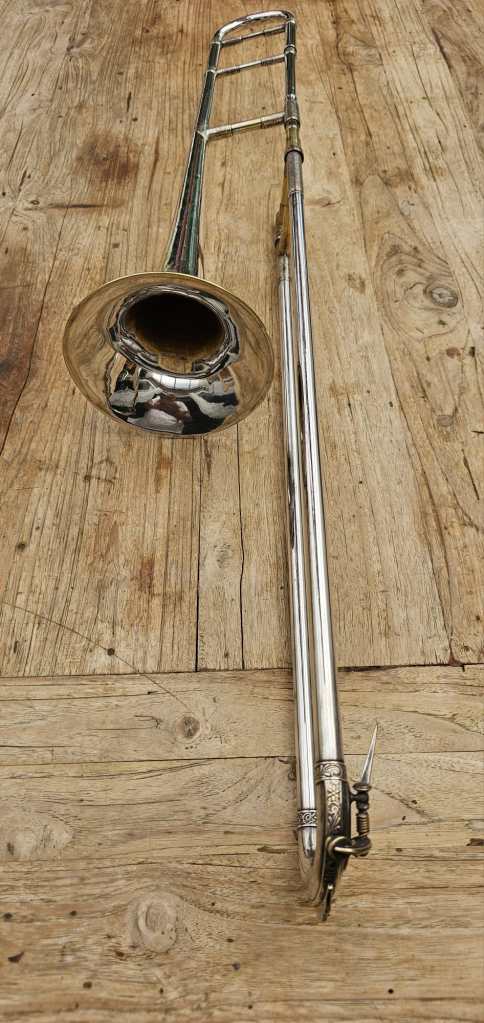 Deze trombone, die meer dan 100 jaar oud is, is in goede staat. De schuif heeft wat slijtage maar werkt goed.