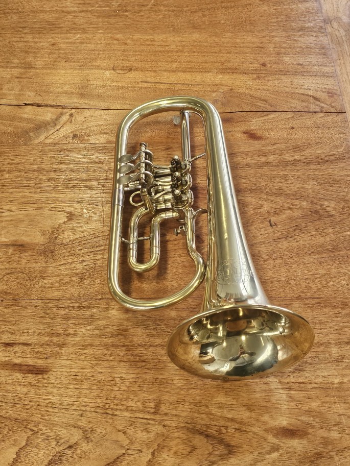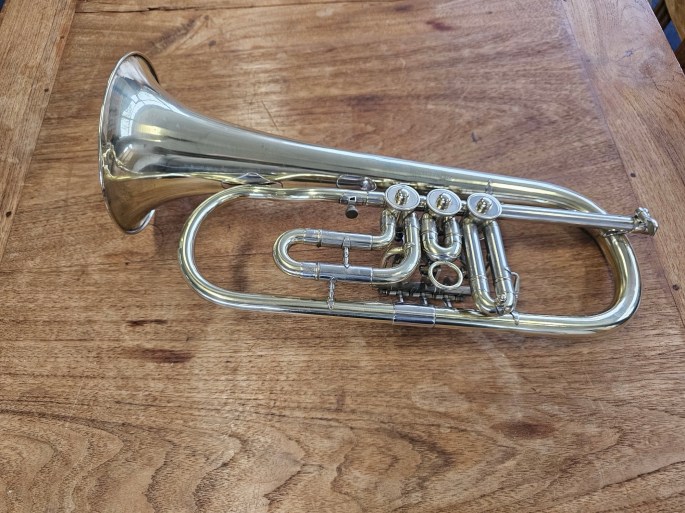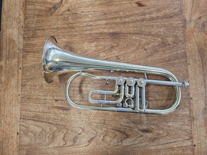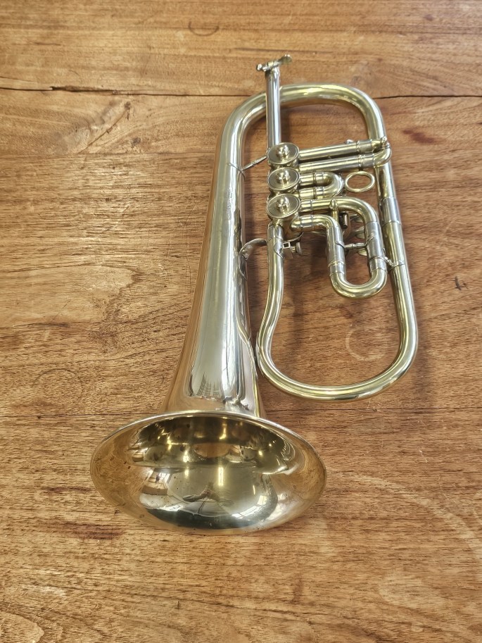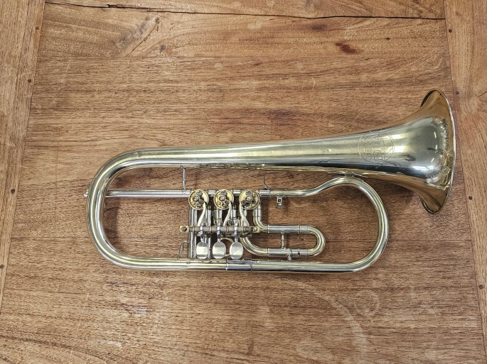 Een mooi Bes-flügelhorn, gebouwd door B&S en verkocht onder de naam Weltklang in de DDR-periode. Dit instrument staat bekend om zijn degelijke bouw en karakteristieke Oost-Duitse klank.