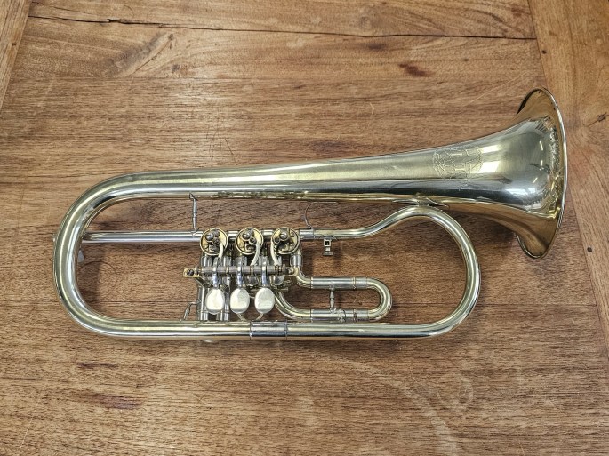 A beautiful Bb flugelhorn, manufactured by B&S and sold under the name Weltklang during the DDR period. This instrument reflects the solid craftsmanship and characteristic sound of East German brass production.