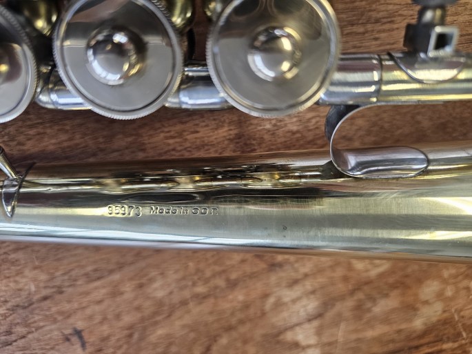 Ein schönes B-Flügelhorn, hergestellt von B&S und vertrieben unter dem Namen Weltklang während der DDR-Zeit. Dieses Instrument steht für die solide Handwerkskunst und den charakteristischen Klang ostdeutscher Blechblasinstrumente.