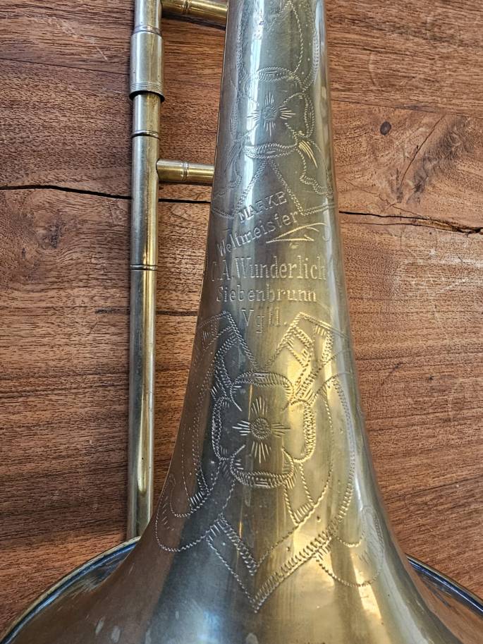 Dies ist eine sehr schöne C.A Wunderlich Siebenbrunn Vogtland Jazz Posaune aus der Zeit um 1930.
