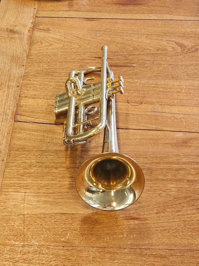 Deze Conn 1000B trompet is een degelijk gebouwd instrument, bekend om zijn heldere, gefocuste klank en uitstekende projectie. De trompet is volledig nagekeken en in goede conditie, klaar om te bespelen. Hij is gelakt met een goudmessing beker.