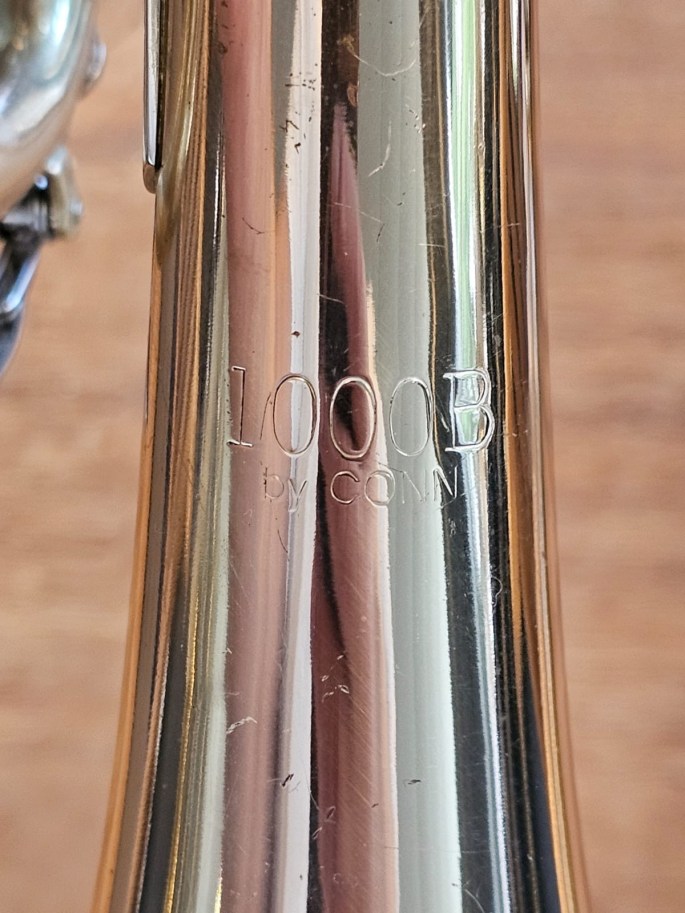 This Conn 1000B trumpet is a well-crafted instrument known for its bright, focused sound and excellent projection. It has been thoroughly inspected and is in good condition, ready to play. It is lacquered with a gold brass bell.