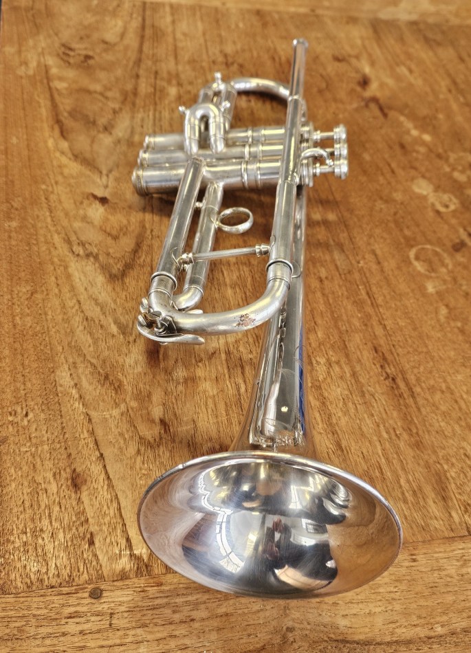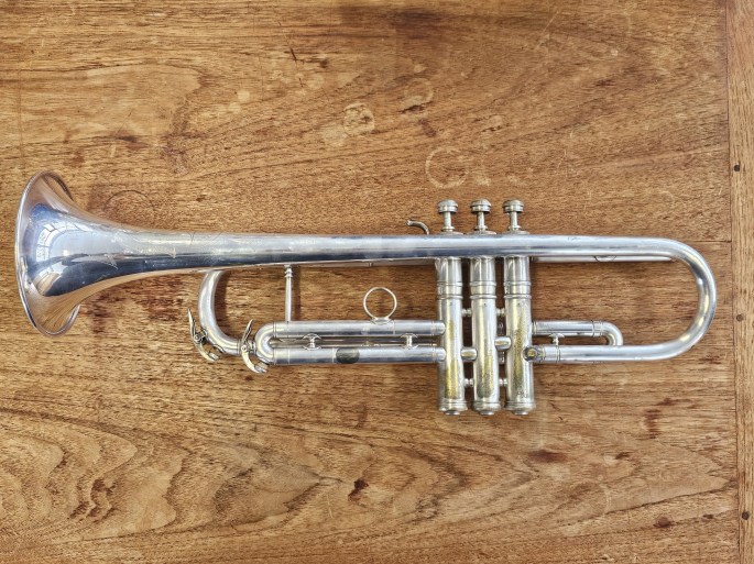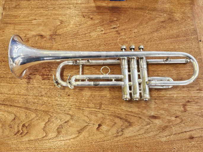 Eine seltene Conn 12B B-Trompete mit dem bekannten Coprion-Schallbecher, ausgeführt in versilberter Ausführung. Das Modell 12B war ursprünglich ausschließlich in lackierter Version erhältlich. Ob diese Trompete ab Werk als Sonderausführung versilbert geliefert wurde oder die Versilberung später erfolgte, ist nicht eindeutig bekannt. Dadurch handelt es sich um ein besonders seltenes Exemplar.