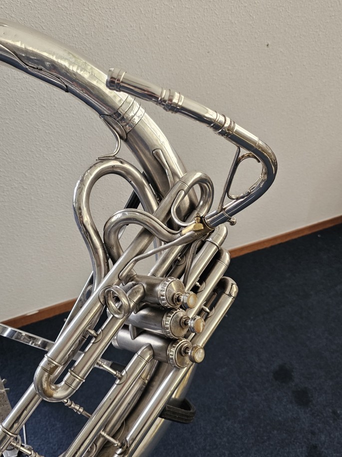 Dieses besondere Conn 20K B-Sousaphon wurde 1946 gebaut und besitzt einen Schallbecher vom Conn Modell 38K mit kleinerem Durchmesser (60 cm) und ohne Gravur. Durch den kleineren Schallbecher erhält das Instrument einen helleren, fokussierteren Klang, ideal für Marschmusik und Brassbands.