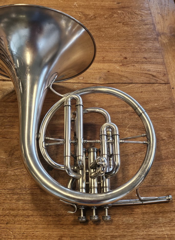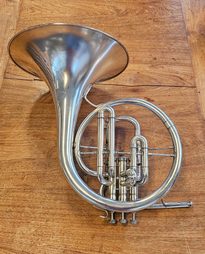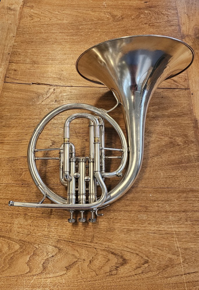 Prachtige en zeldzame C.G. Conn mellofoon in F, gebouwd in 1942 voor de Amerikaanse overheid. Het instrument verkeert in zeer mooie staat, is geheel nagekeken en speelklaar.