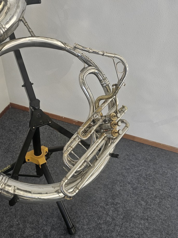 Das Instrument wurde vollständig überprüft und ist technisch in gutem Zustand sowie sofort spielbereit. Die Ventile laufen leichtgängig und das Instrument spricht in allen Lagen gut an.