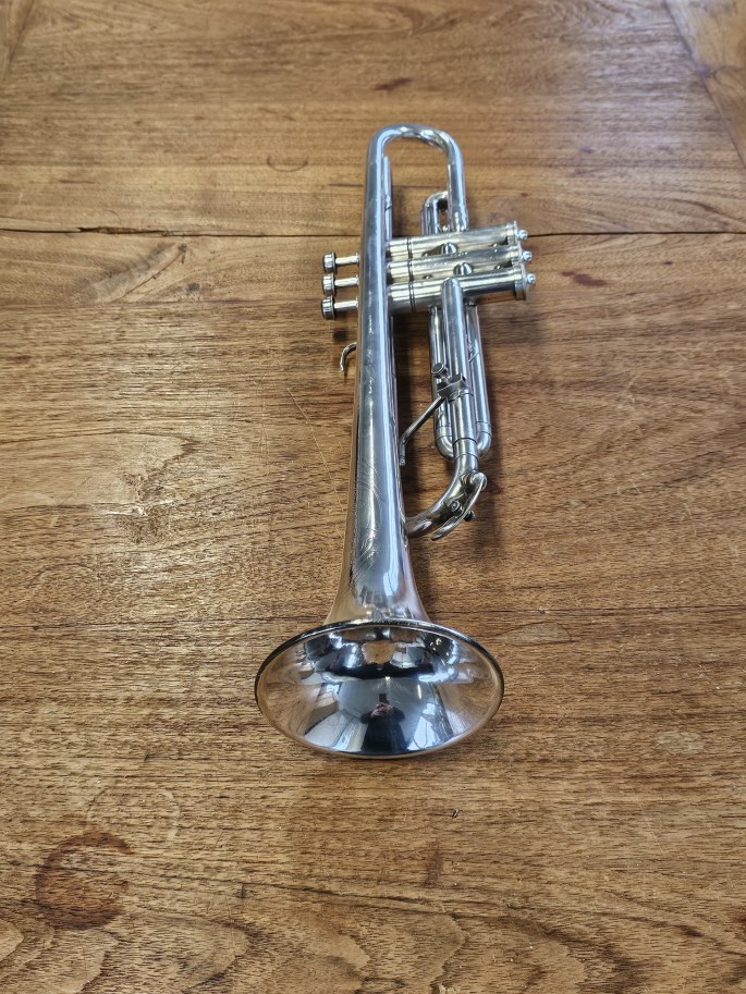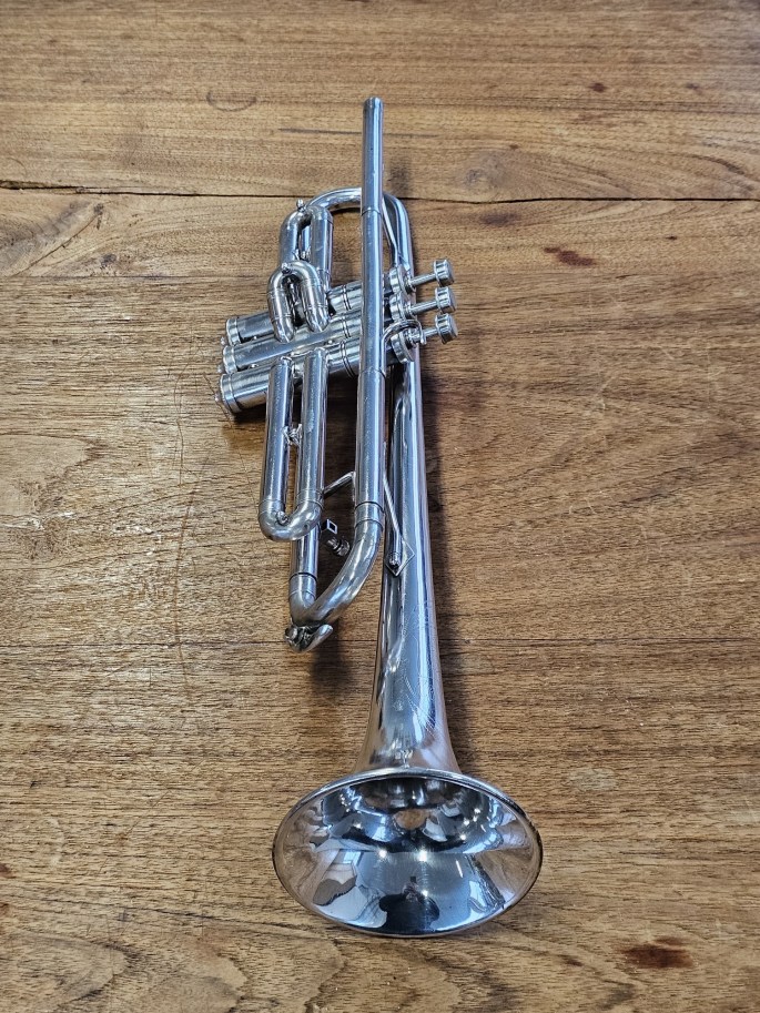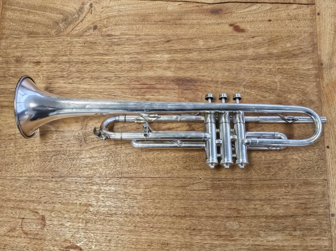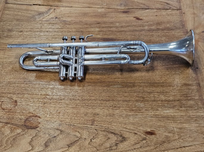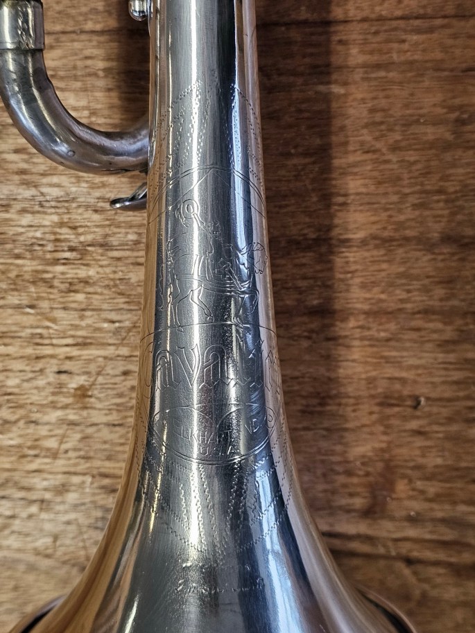 Diese B-Trompete wurde von Cavalier gebaut, einer Untermarke von Pan American, die wiederum zu Conn gehörte. Das Instrument entstand zwischen 1933 und 1948 und wurde komplett überprüft. Es befindet sich in guter, spielbarer Kondition und bietet einen warmen, zentrierten Klang.