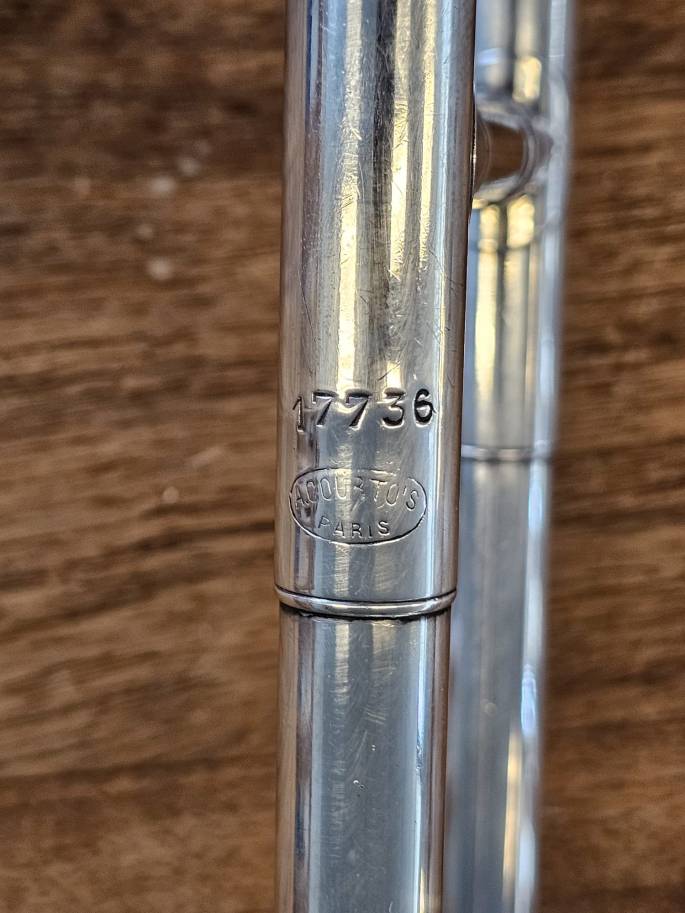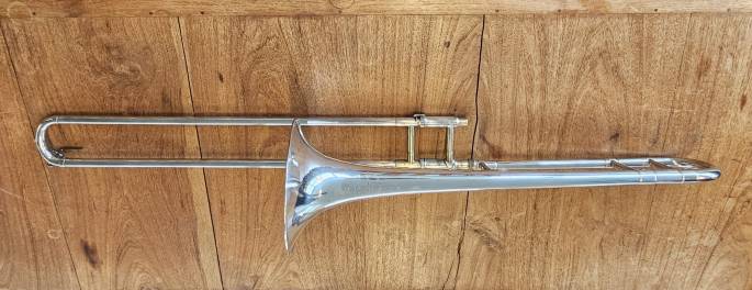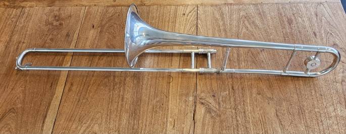 Deze verzilverde trombone is in goede staat. De schuif voelt goed aan en beweegt goed.