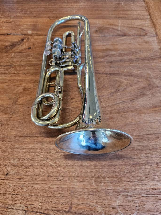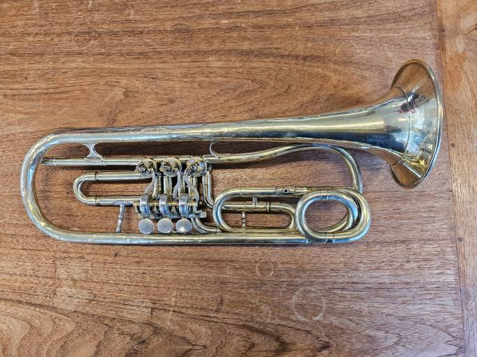 Suchen Sie ein einzigartiges Instrument mit Charakter? Diese Basstrompete in Es, gefertigt von einem talentierten tschechischen Hersteller, steht jetzt zum Verkauf!