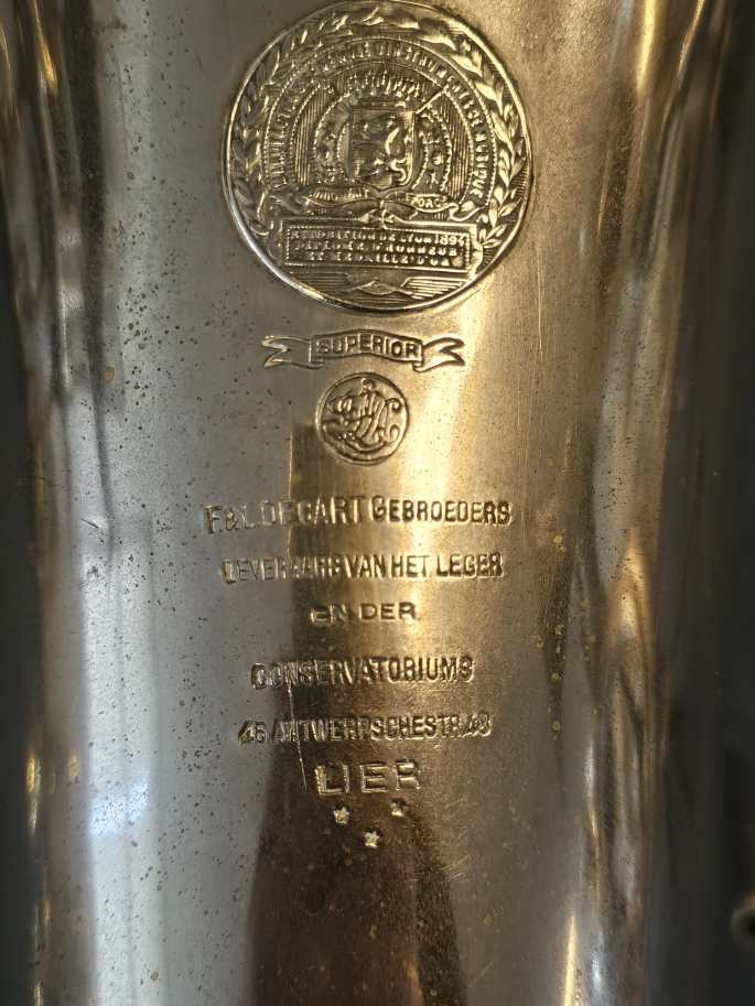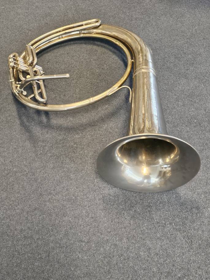 Een prachtig gebouwde Es helicon tuba, gemaakt door Gebroeders Décart uit Lier. Dit instrument is volledig nagekeken en verkeert in goede staat, met een warme en volle klank.