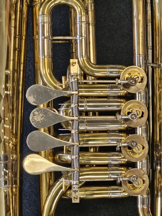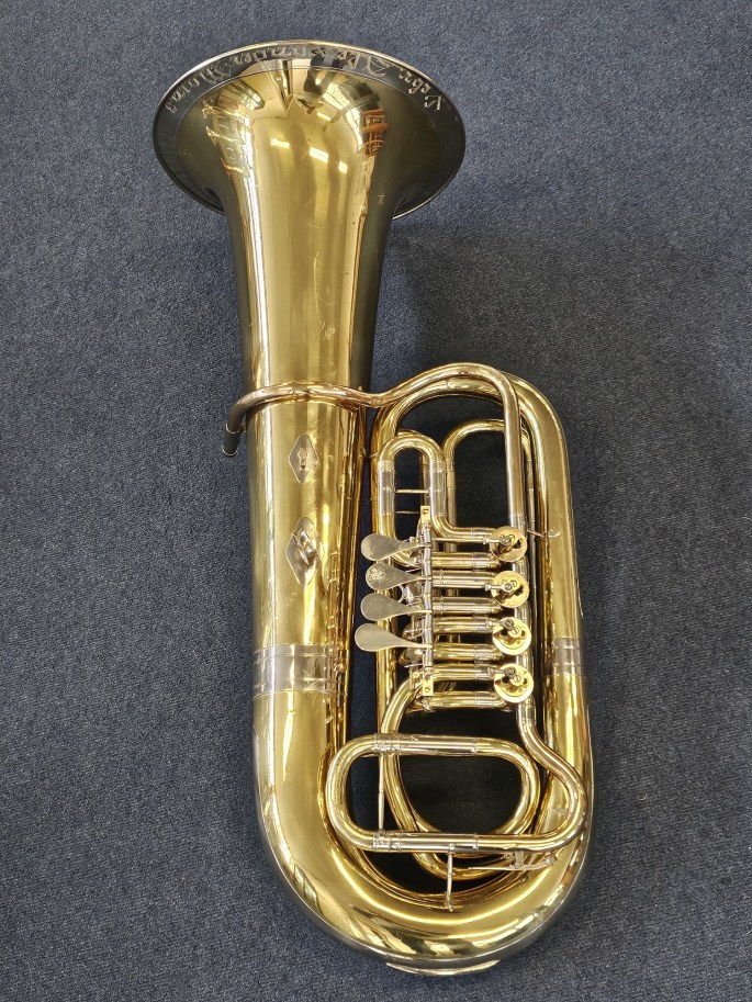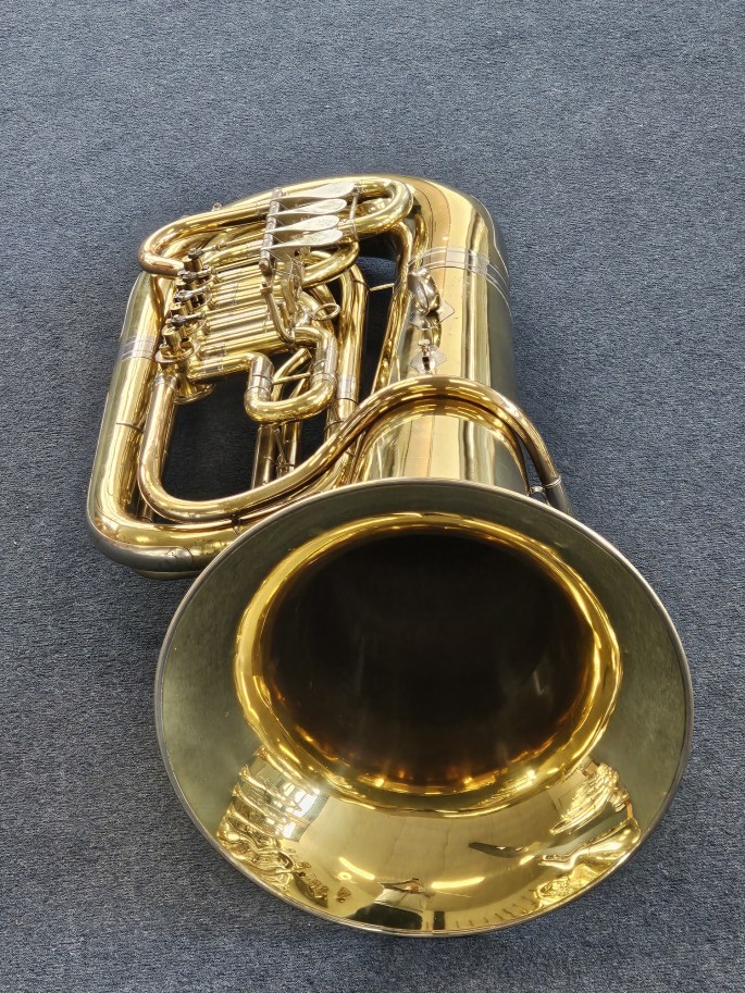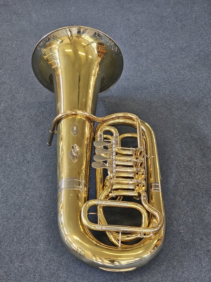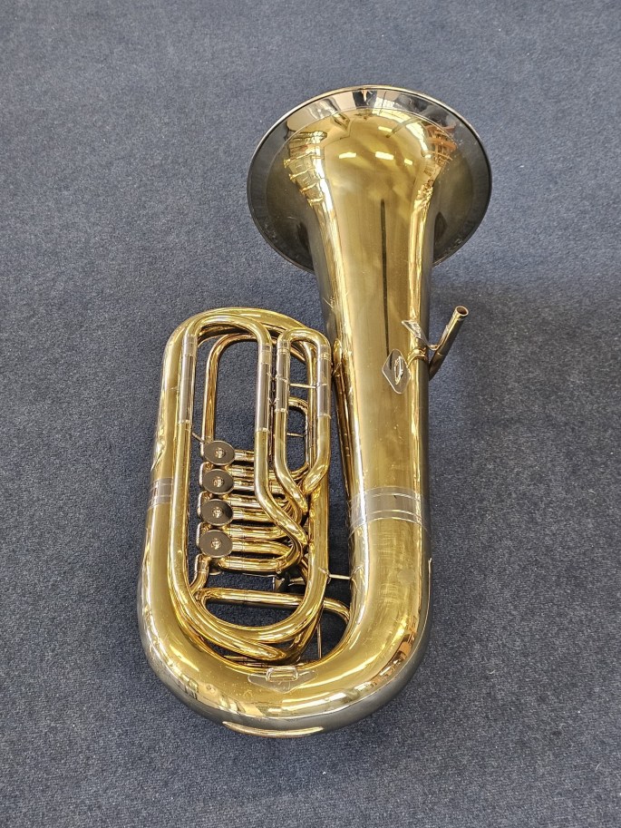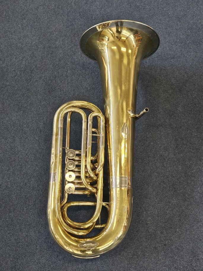 Een hoogwaardige Es-bastuba, model 154, gebouwd door Gebr. Alexander Mainz aan het einde van de jaren ’80. Dit betreft een relatief recent exemplaar van dit gerenommeerde Duitse model. De tuba is volledig nagekeken en speelklaar.