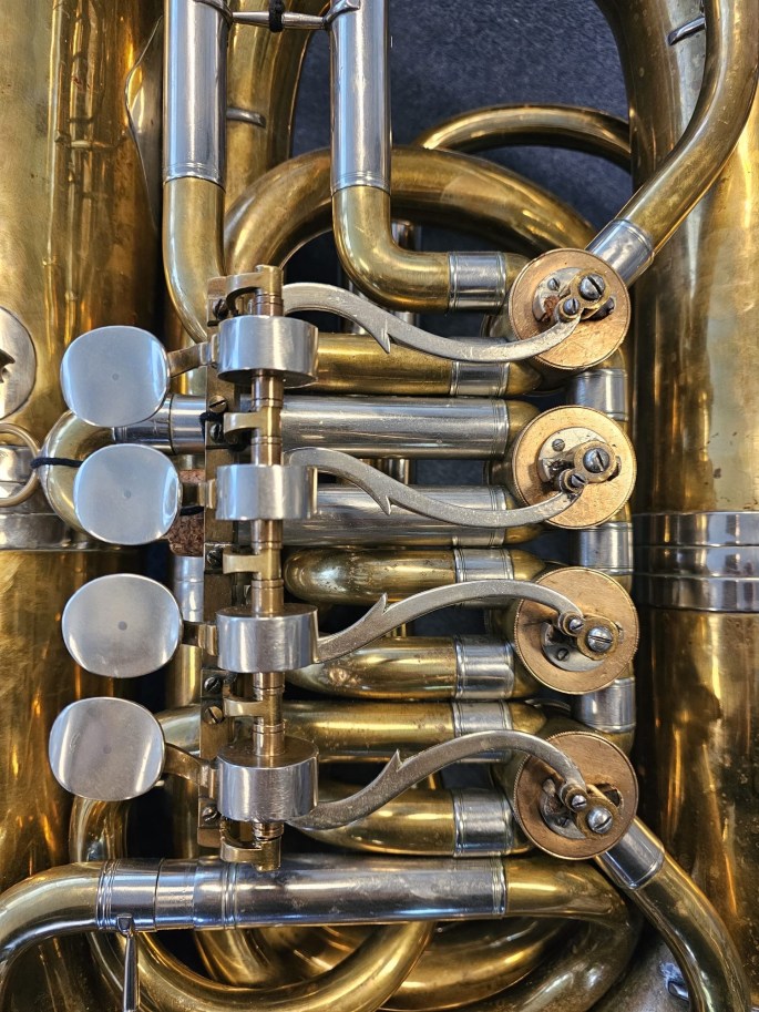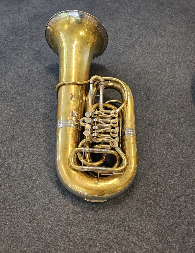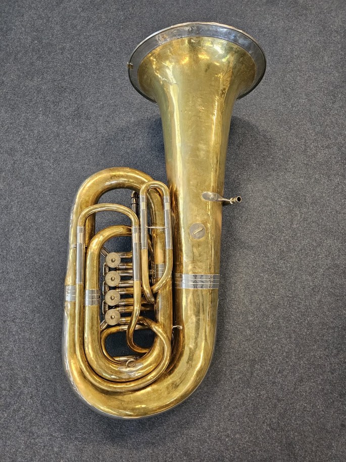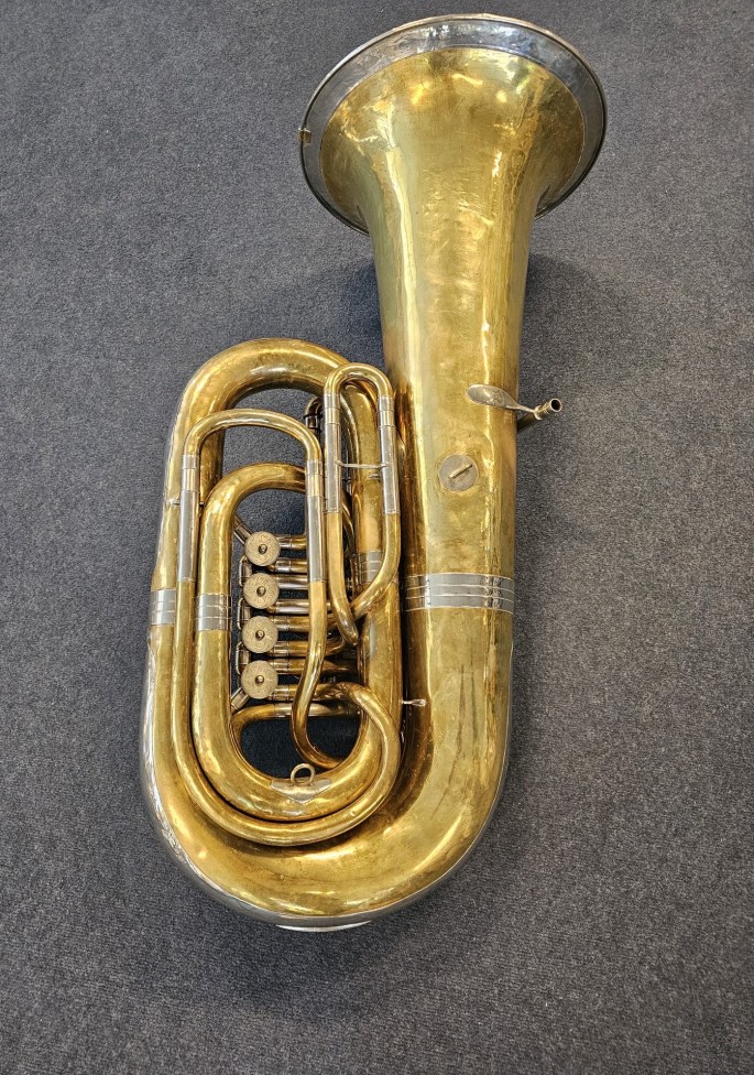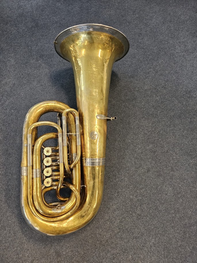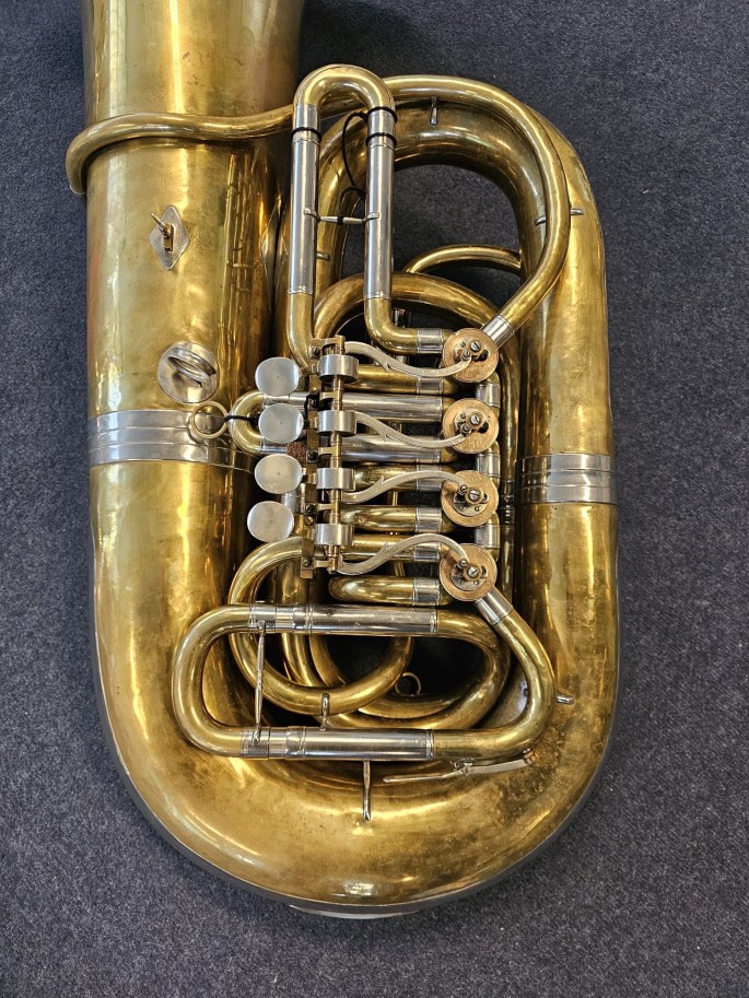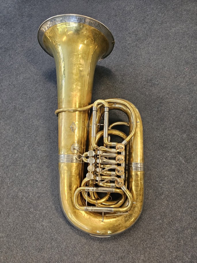 Diese Tuba ist wahrscheinlich in der ersten Hälfte des 20. Jahrhunderts entstanden. Sie ist in sehr gutem Zustand, allerdings gibt es eine kleine Reparatur am Schallbecher (nicht spürbar beim Spielen und beeinträchtigt den Klang nicht).