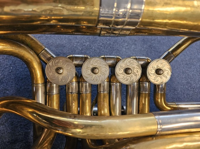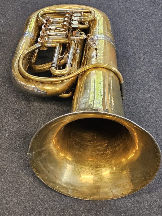 This tuba is probably made during the first half of the 20th century. It is in very good condition, however there’s a small repair on the bell (not noticeable during playing and doesn’t affect the sound).