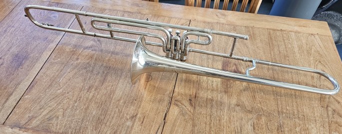 Een fraaie Bes ventieltrombone, gemaakt door de Gebroeders de Prins uit Antwerpen. Dit instrument is geheel nagekeken en in goede conditie, met een mooie, volle klank.