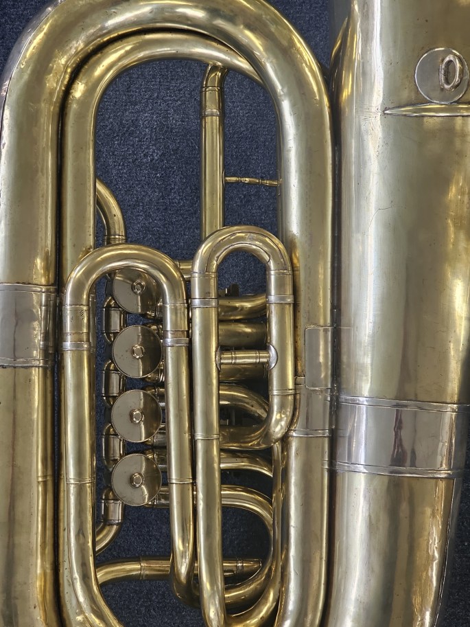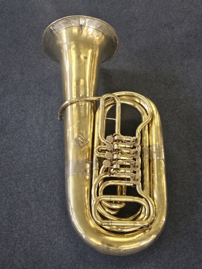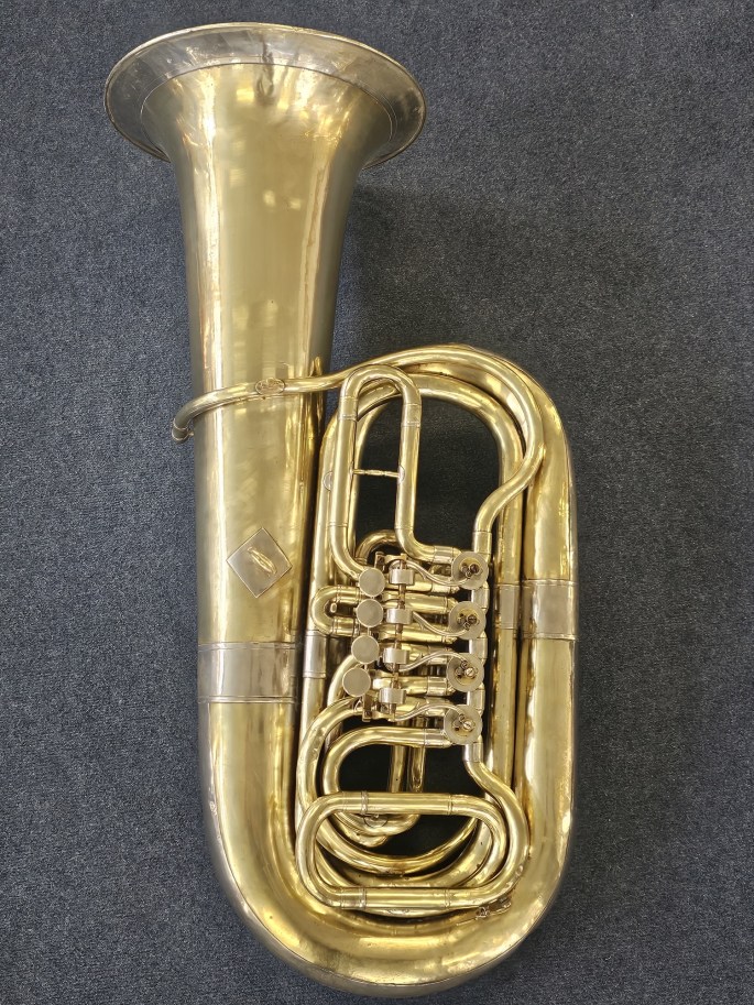 Zum Verkauf steht eine kompakte 3/4 B Tuba eines unbekannten deutschen Herstellers. Das Instrument verfügt über 4 Ventile, wobei das 4. Ventil eine besondere Ausführung hat: Es ist kein gewöhnliches Quartventil, sondern entspricht der Länge des 2. und 3. Ventils zusammen (ca. 2,5 Töne).