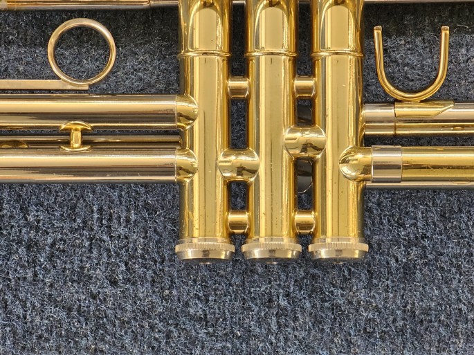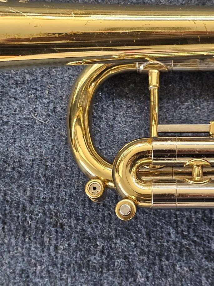Diese lackierte Trompete hat einen manuellen Trigger am 1. Zug und einen manuellen Trigger am 3.