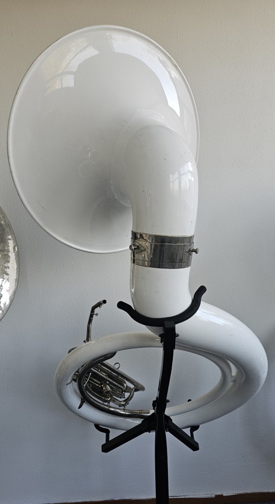 Ein einzigartiges und seltenes Fiberglass Kontrabass-Bugle in G, auch bekannt als G-Sousaphon mit D-Ventil, gefertigt von Glassl / Schenkelaars. Ein echtes Sammlerstück für Liebhaber Niederländischer Trommel- und Trompetenkorps oder amerikanischer Marching-Band-Tradition.