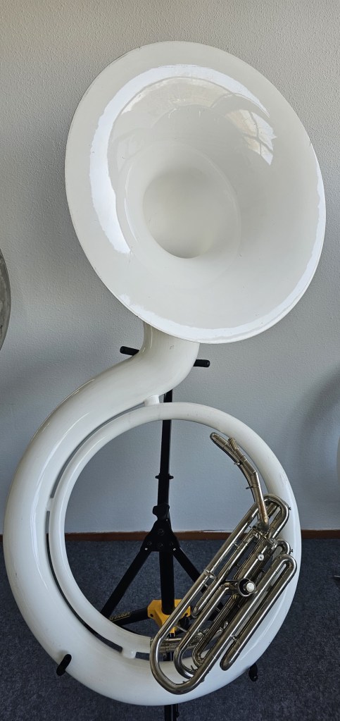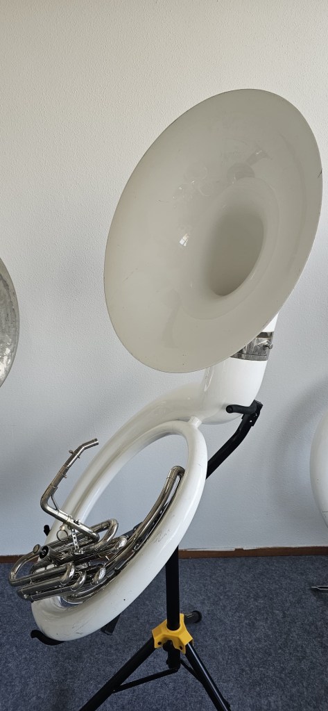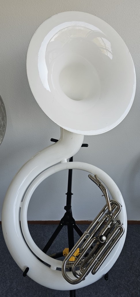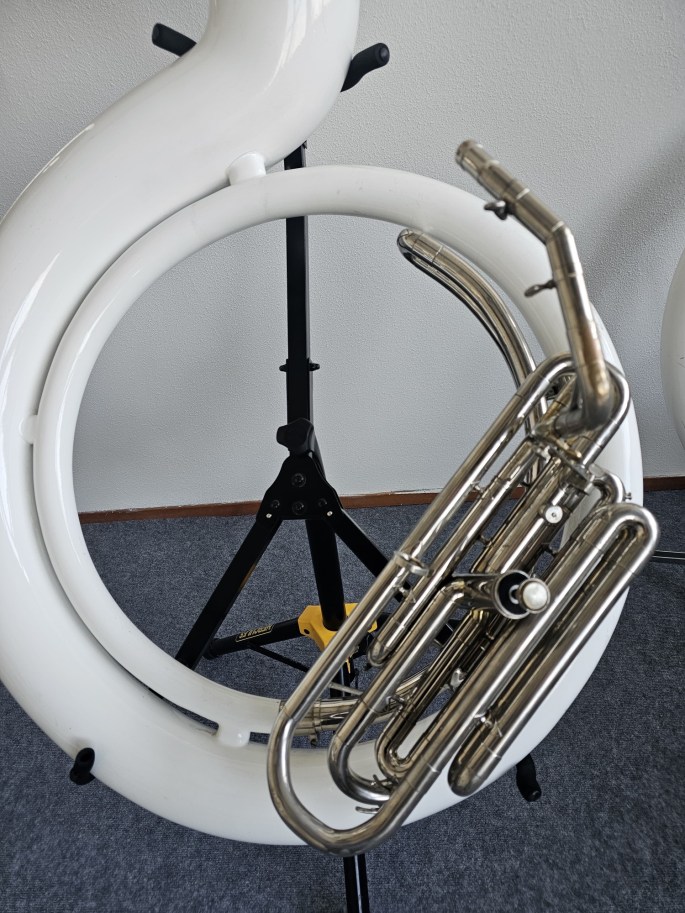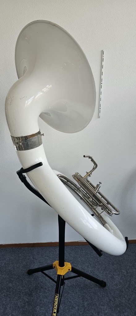 A unique and rare plastic contrabass bugle in G, also known as a G sousaphone with D valve, made by Glassl / Schenkelaars. A true collector’s item for enthusiasts of traditional Dutch Drumband/Trumpet Band or American marching band tradition.