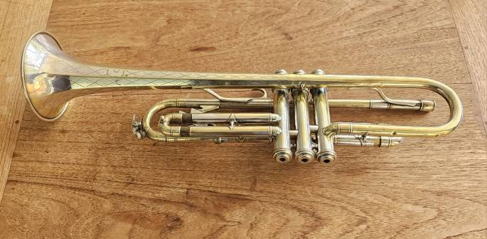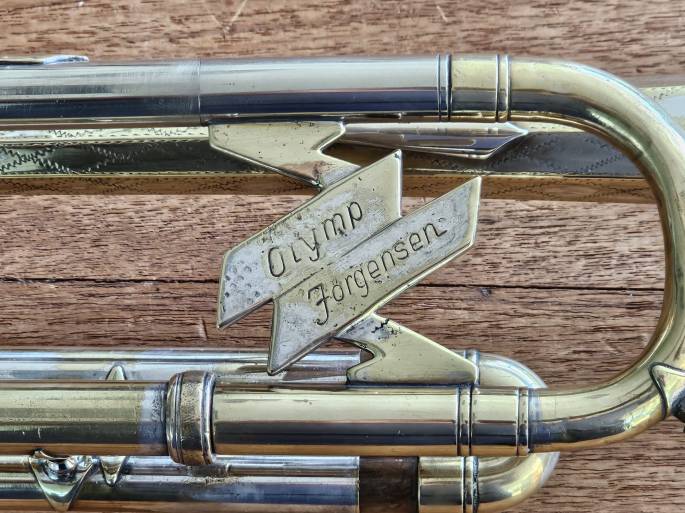 A unique and rare Bb trumpet, model Olymp, made by Jörgensen, featuring a distinctive octagonal bell. This instrument has been thoroughly checked and is in good condition, delivering a rich and clear sound.