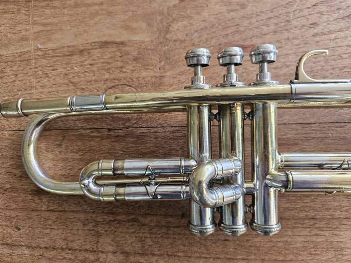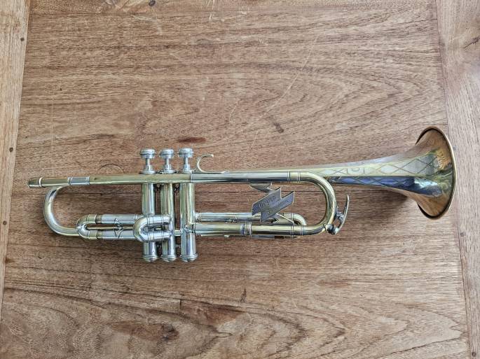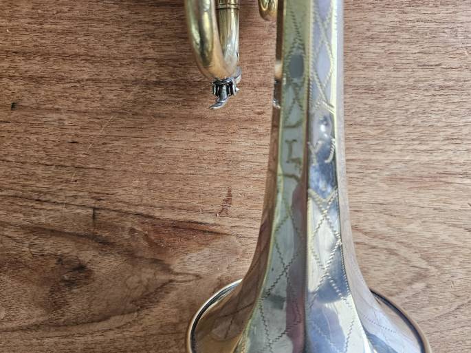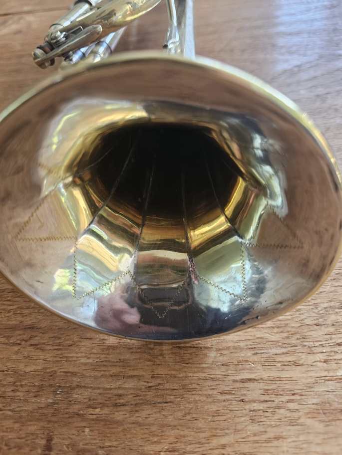 Een uitzonderlijke en zeldzame Bb trompet, model Olymp, gemaakt door Jörgensen, met een opvallende achthoekige beker. Dit instrument is volledig nagekeken en verkeert in goede staat, met een heldere en volle klank.