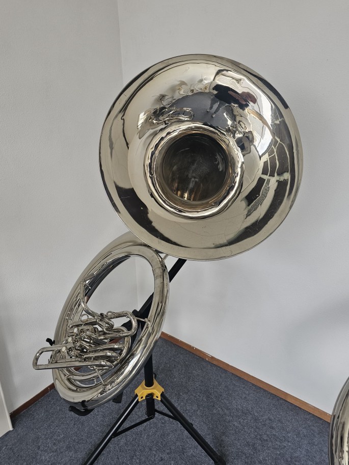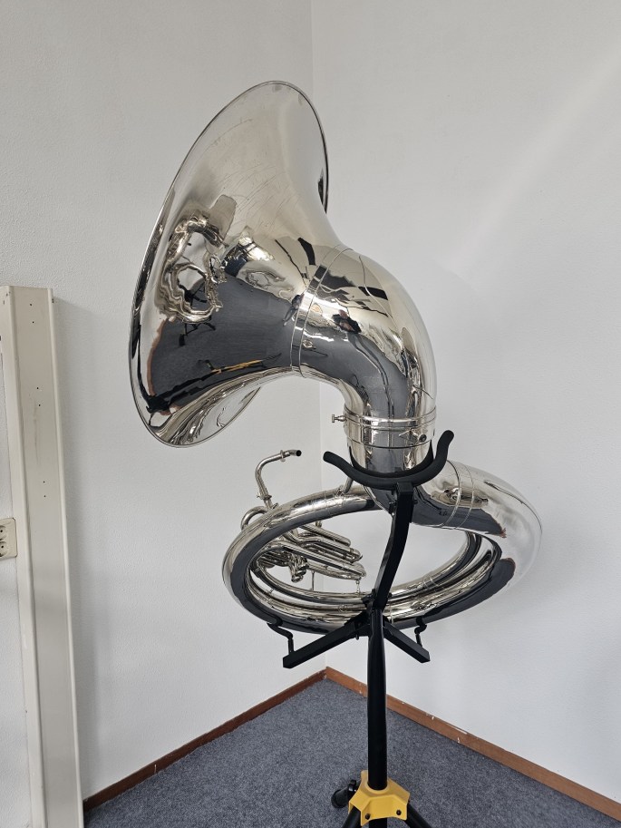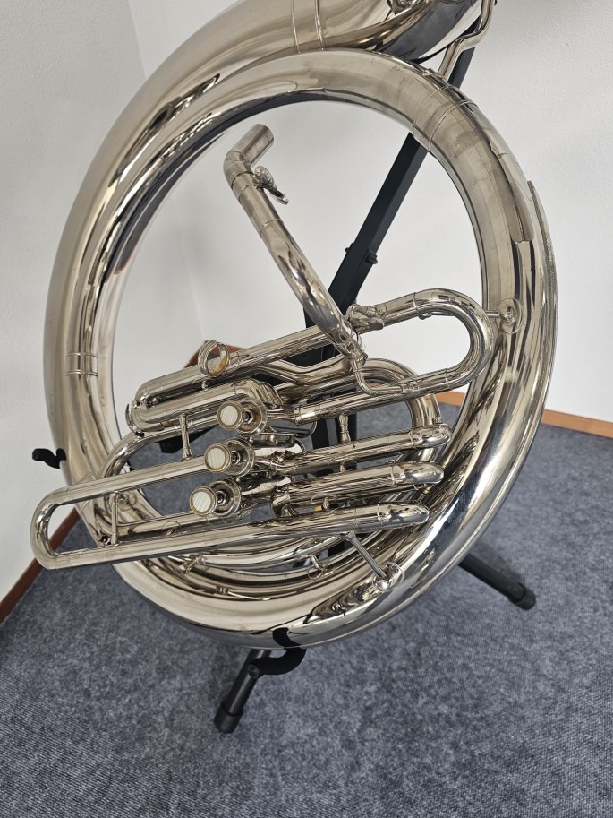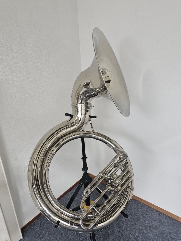 Ein Jupiter JSH-594 B-Sousaphon in vernickelter Ausführung, bekannt für seine robuste Bauweise und seinen kraftvollen Klang. Dieses Modell ist eine Kopie des bekannten King 2350 und bietet ähnliche Spieleigenschaften und Projektion. Das Instrument wurde vollständig überprüft und ist spielbereit.