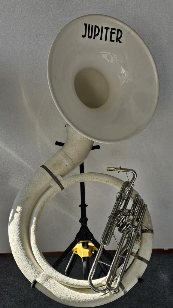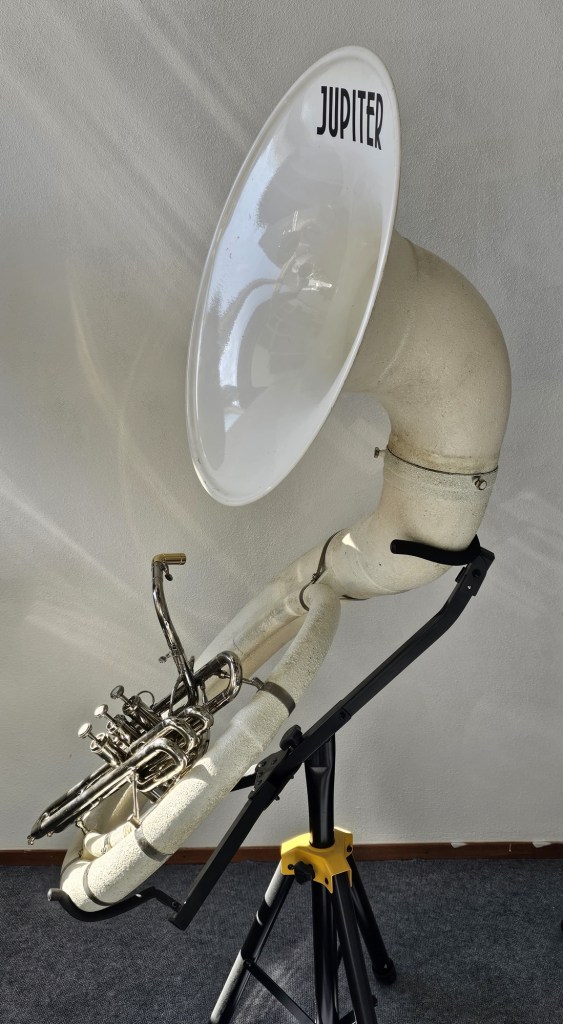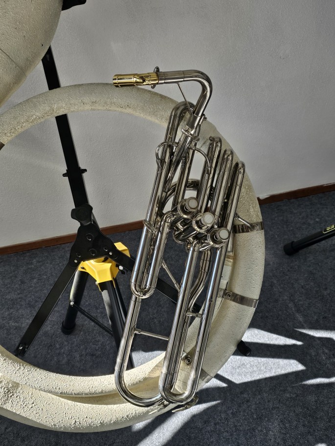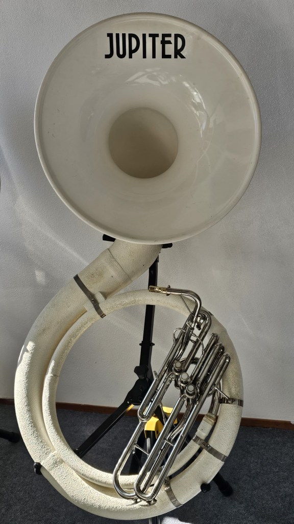 Zum Verkauf steht ein Jupiter Fiberglas Sousaphon in B, Modell JSH-596. Das Instrument wurde vollständig überprüft und befindet sich in gutem Zustand. Es lässt sich leicht spielen und bietet einen vollen, kräftigen Klang – ideal für Blaskapellen, Marching Bands und Straßenmusik.